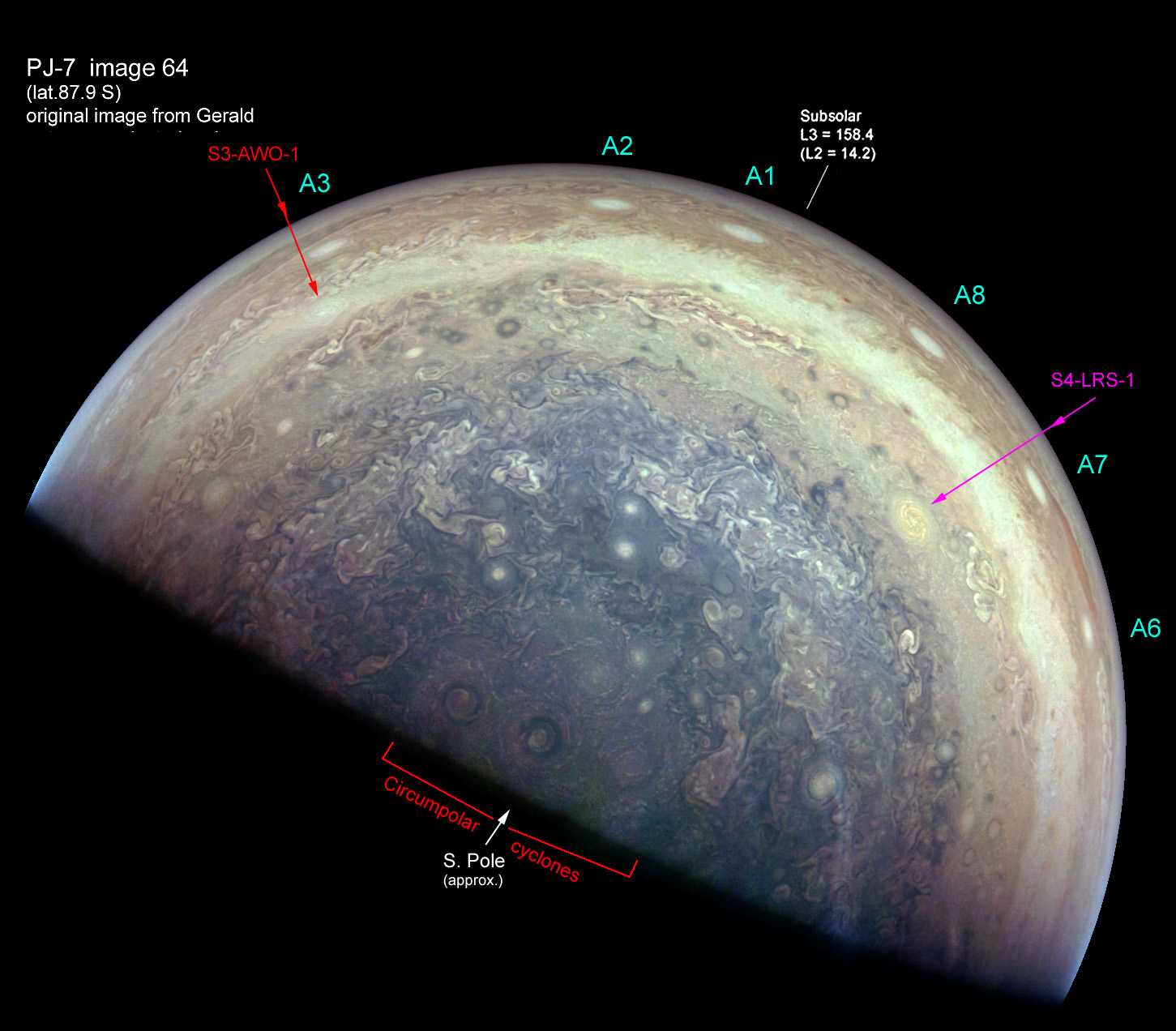 The view over the south pole at PJ7 (image 64 as processed by Gerald), with some of the now-familiar features labelled.