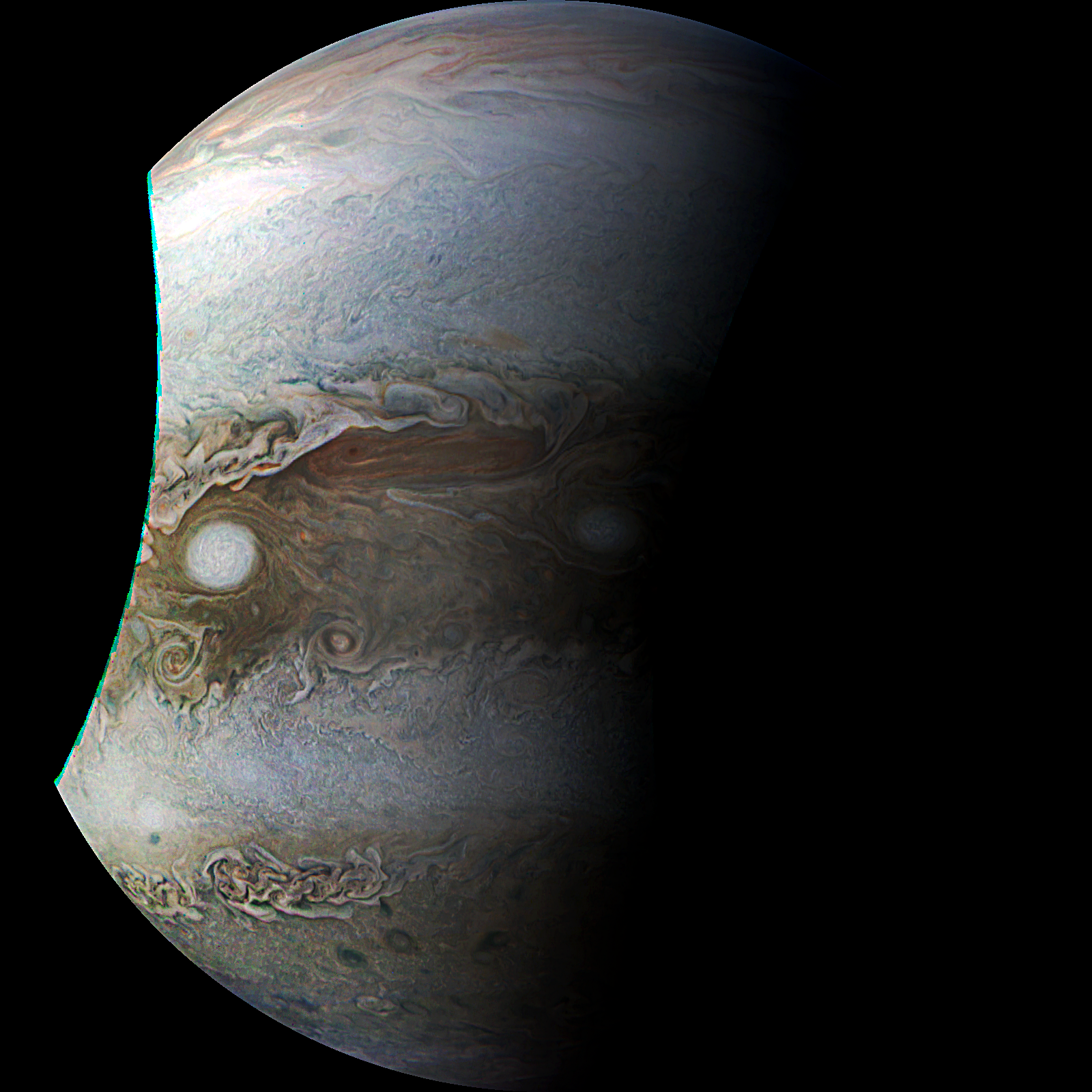 Junocam pixels are 12 bits deep from the camera but are converted to 8 bits inside the instrument using a lossless "companding" table, a process similar to gamma correction, to reduce their size. All Junocam products on the missionjuno website are in this 8-bit form as received on Earth. Scientific users interested in radiometric analysis should use the "RDR" data products archived with the Planetary Data System, which have been converted back to a linear 12-bit scale.