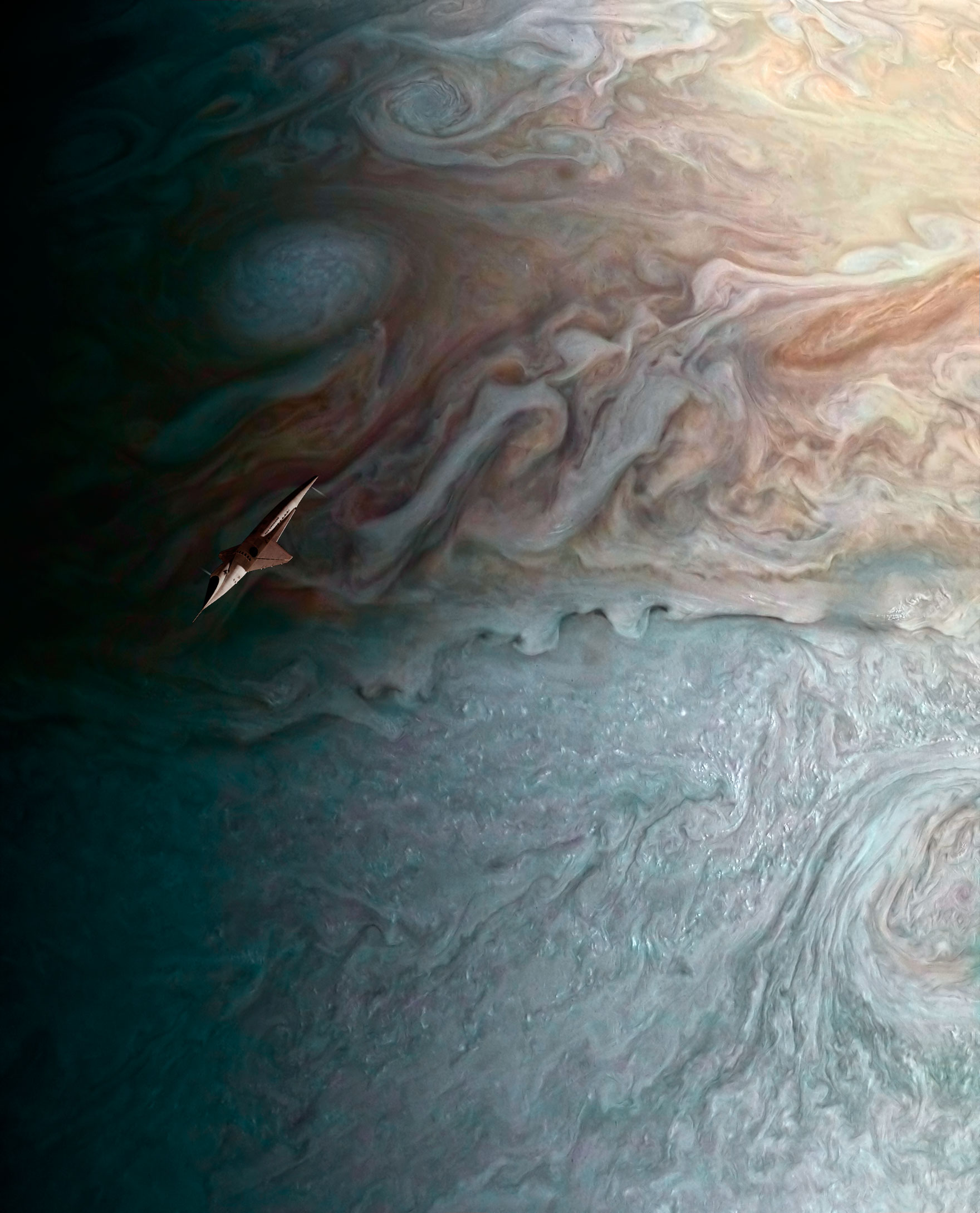 After a long transit from Earth, the Pan Am Orion III spaceplane maneuvers with its reaction control jets to get the best view of the gas giant, staying just ahead of the growing shadow side of the planet.