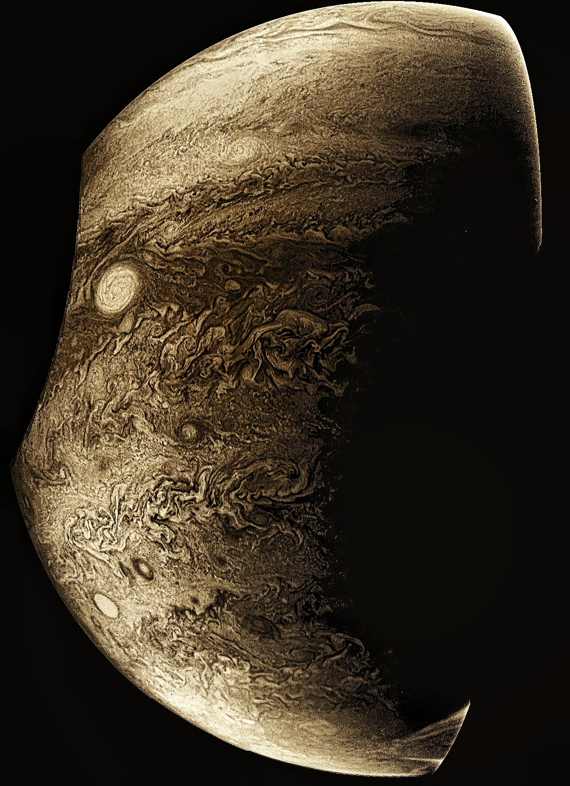 Junocam pixels are 12 bits deep from the camera but are converted to 8 bits inside the instrument using a lossless "companding" table, a process similar to gamma correction, to reduce their size. All Junocam products on the missionjuno website are in this 8-bit form as received on Earth. Scientific users interested in radiometric analysis should use the "RDR" data products archived with the Planetary Data System, which have been converted back to a linear 12-bit scale.