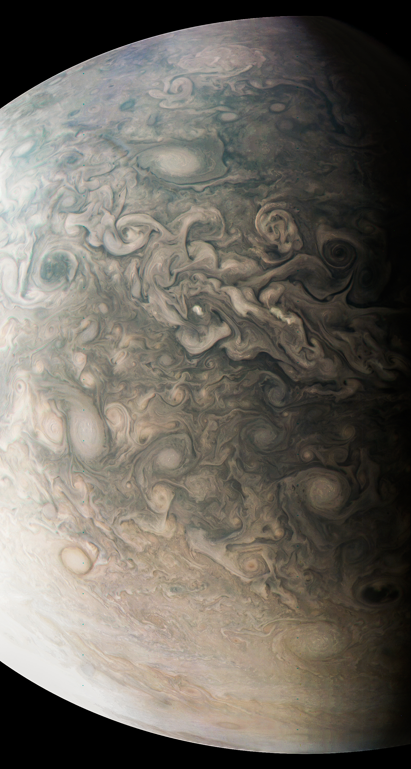 Junocam pixels are 12 bits deep from the camera but are converted to 8 bits inside the instrument using a lossless "companding" table, a process similar to gamma correction, to reduce their size. All Junocam products on the missionjuno website are in this 8-bit form as received on Earth. Scientific users interested in radiometric analysis should use the "RDR" data products archived with the Planetary Data System, which have been converted back to a linear 12-bit scale.