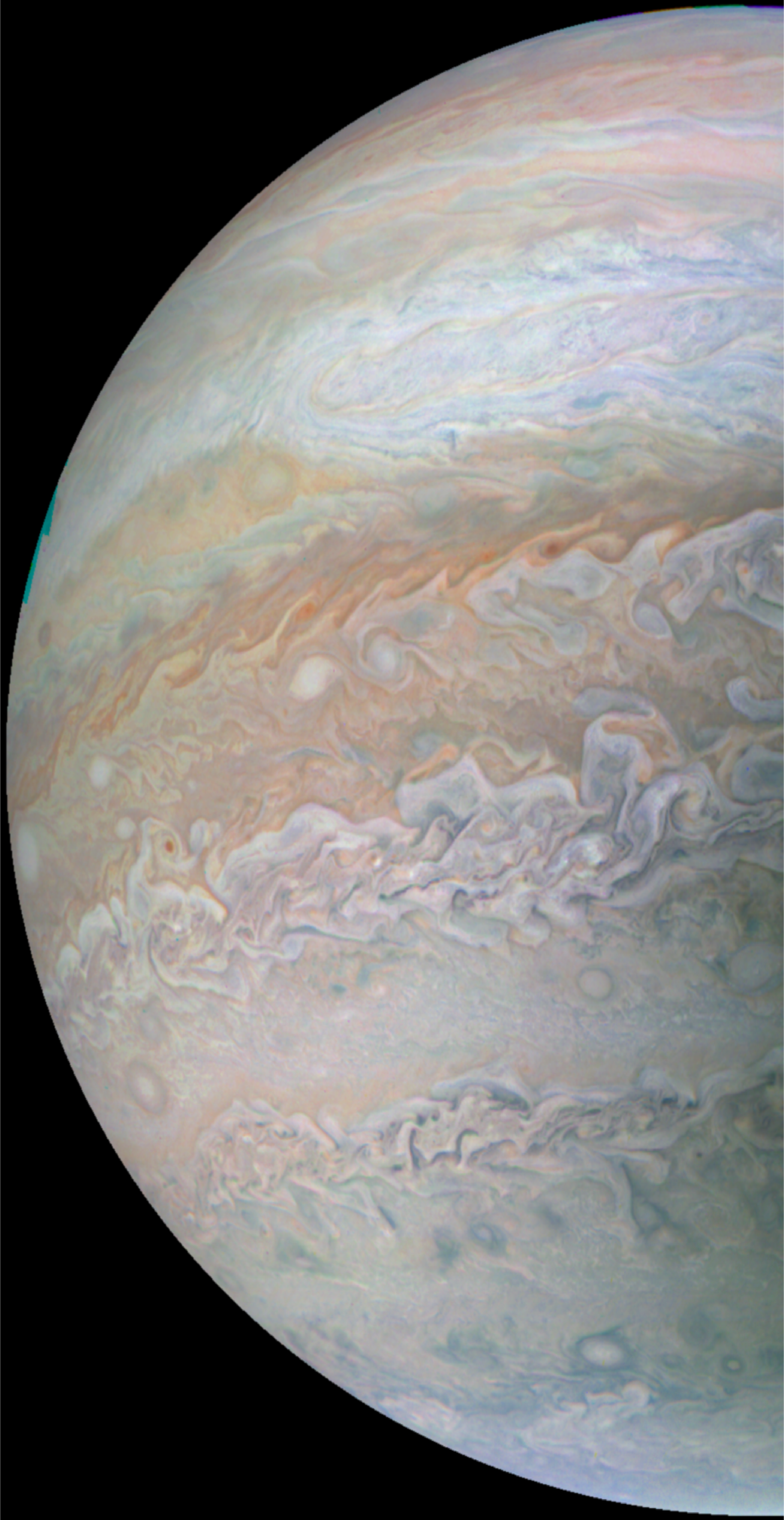 Junocam pixels are 12 bits deep from the camera but are converted to 8 bits inside the instrument using a lossless "companding" table, a process similar to gamma correction, to reduce their size. All Junocam products on the missionjuno website are in this 8-bit form as received on Earth. Scientific users interested in radiometric analysis should use the "RDR" data products archived with the Planetary Data System, which have been converted back to a linear 12-bit scale.