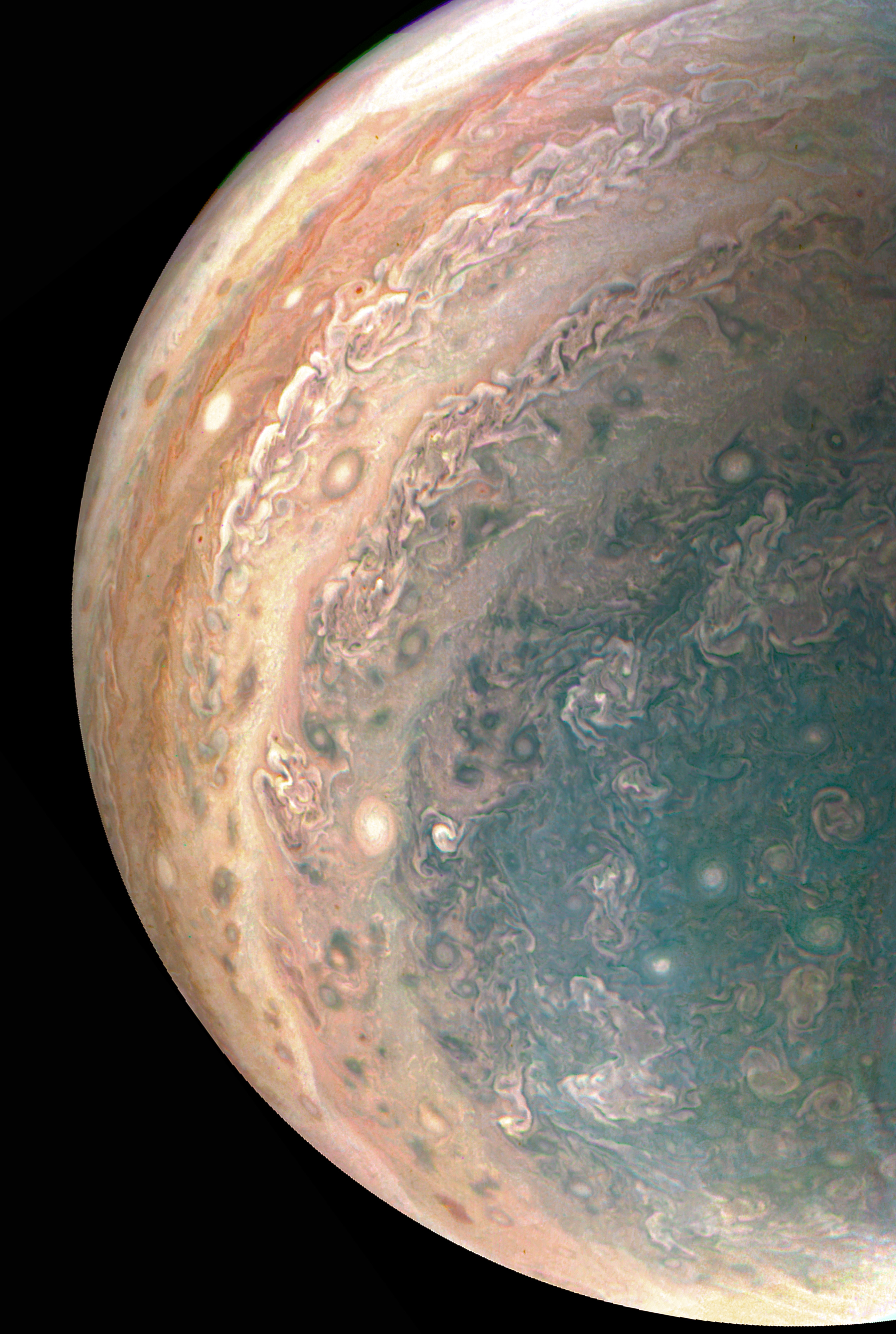 Jupiter seen from the South Pole. The original Juno picture has been cropped and rotated to remove artifacts on the ege of the camera. Colors have been balanced trying to strike the same balance than in the Voyager 1 Picture of the Day (on September 5 2017).