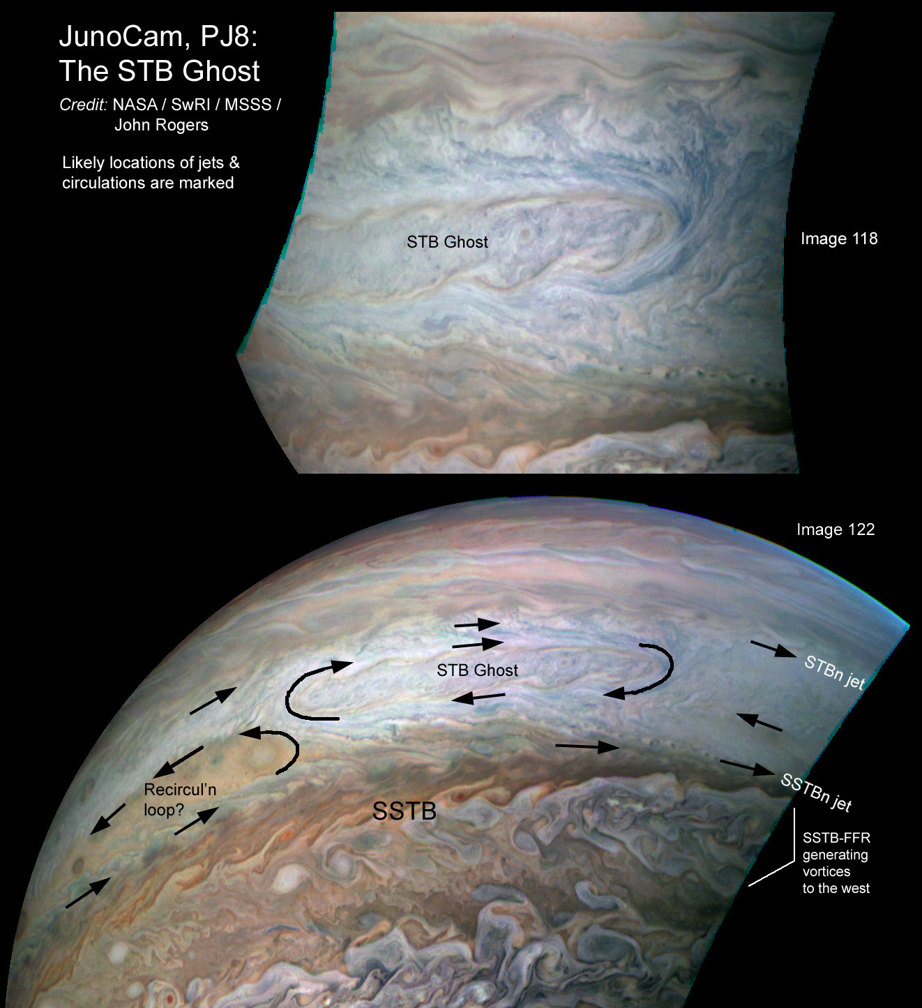 JunoCam captured the whole of this faint but important feature in a thorough sequence of images (118-123), which should enable measurements of its cyclonic circulation. It looks as though it may have a ‘recirculation loop’ to the southwest, as we expected since a similar feature was seen in the PJ5 images of the STB Spectre. --John Rogers.
