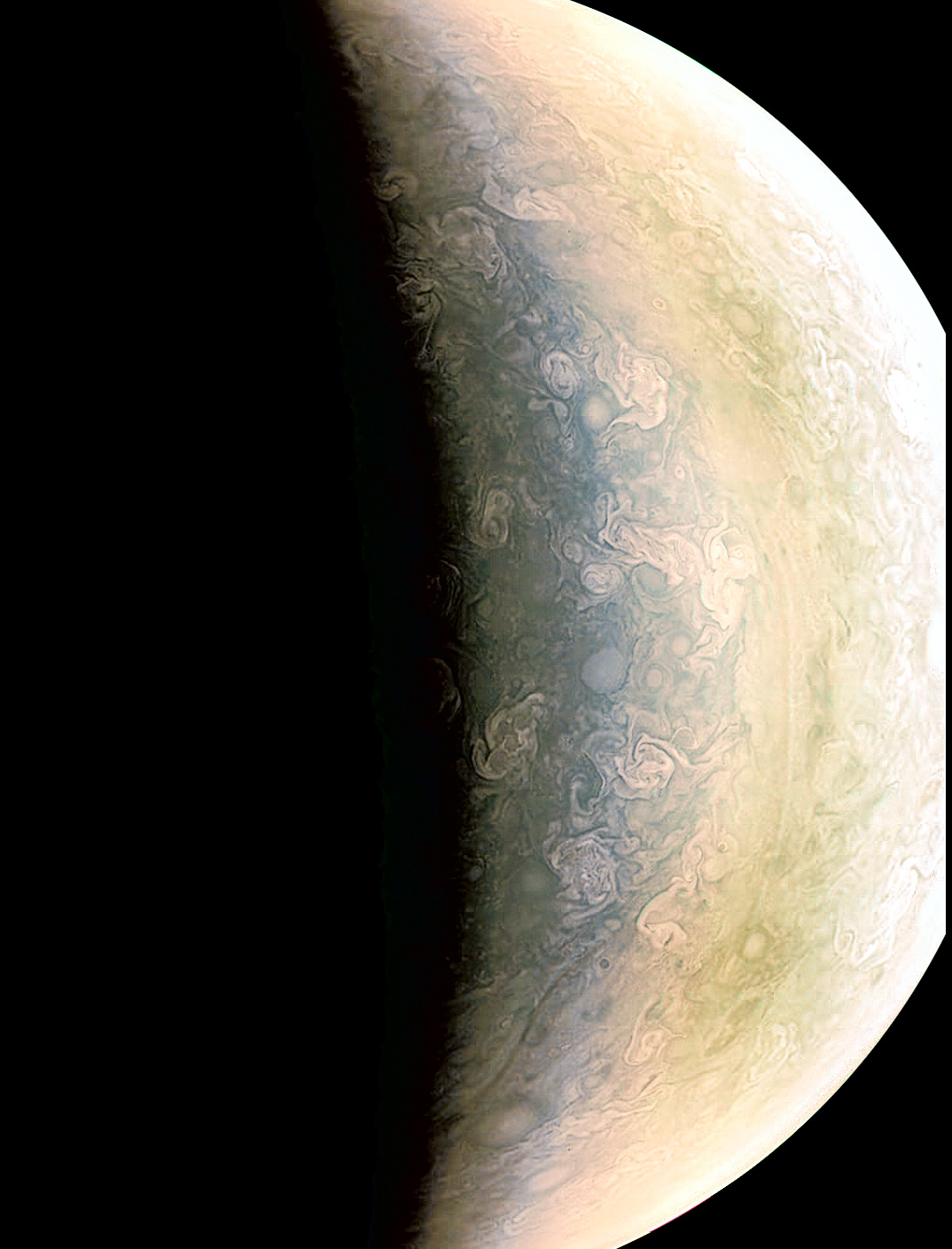 Those clouds, ciclones and other weather feature presented and captured by JUNO cam show us details without precedent that has inspired to contrasting them with touch of edit.