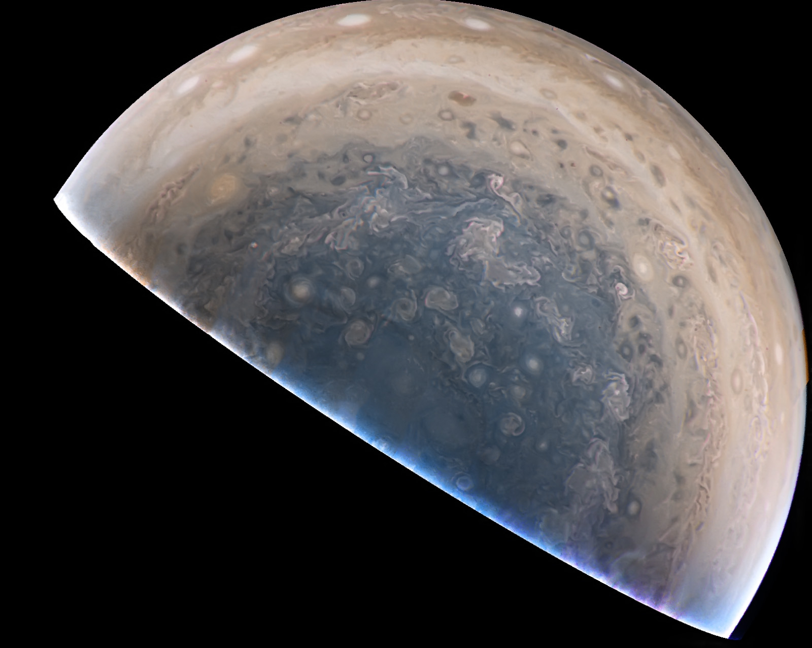 Junocam pixels are 12 bits deep from the camera but are converted to 8 bits inside the instrument using a lossless "companding" table, a process similar to gamma correction, to reduce their size. All Junocam products on the missionjuno website are in this 8-bit form as received on Earth. Scientific users interested in radiometric analysis should use the "RDR" data products archived with the Planetary Data System, which have been converted back to a linear 12-bit scale.
