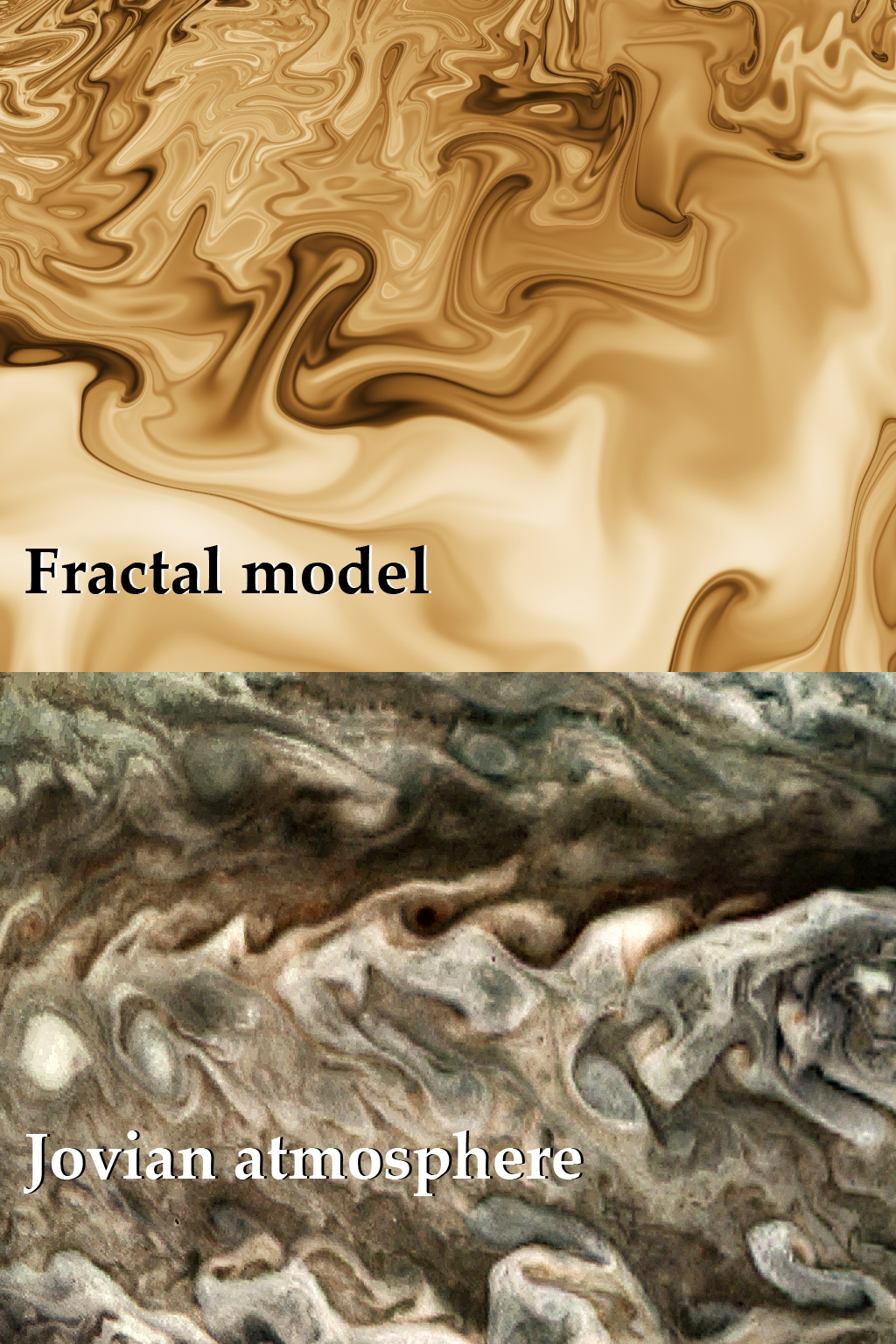 Fractal geometry underlies the complexity and organization of many natural phenomena. The strangely and beautifully shaped turbulence patterns in the Jovian atmosphere are fractal-like. The top panel shows a relatively simple fractal model generated using Ultrafractal 5 software using a Mandelbot set with an inside coloring algorithm by Mark Townsend called "Advanced Gnarl" (both random and directed seed parameters in six sine and cosine functions were used). The bottom panel shows a closeup of cloud turbulence from the Perijove 8 flyby. Eddy patterns, isolated spots, and square-like turbulence arms found in the Jovian clouds are modeled in the fractal image.