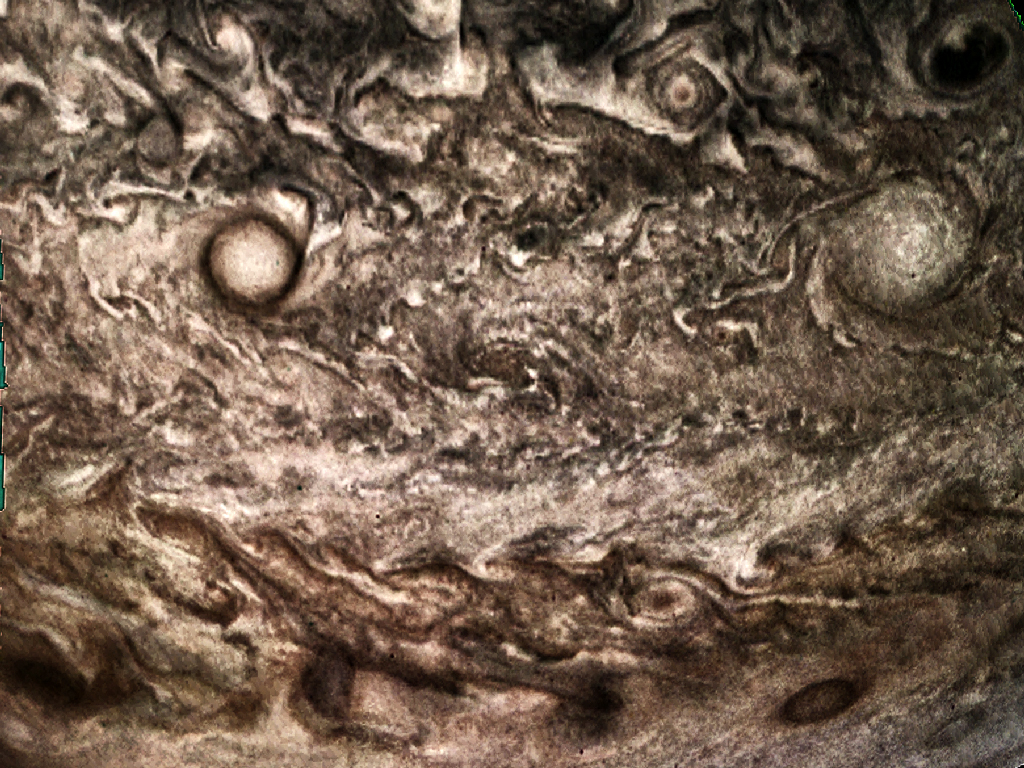 Junocam pixels are 12 bits deep from the camera but are converted to 8 bits inside the instrument using a lossless "companding" table, a process similar to gamma correction, to reduce their size. All Junocam products on the missionjuno website are in this 8-bit form as received on Earth. Scientific users interested in radiometric analysis should use the "RDR" data products archived with the Planetary Data System, which have been converted back to a linear 12-bit scale.