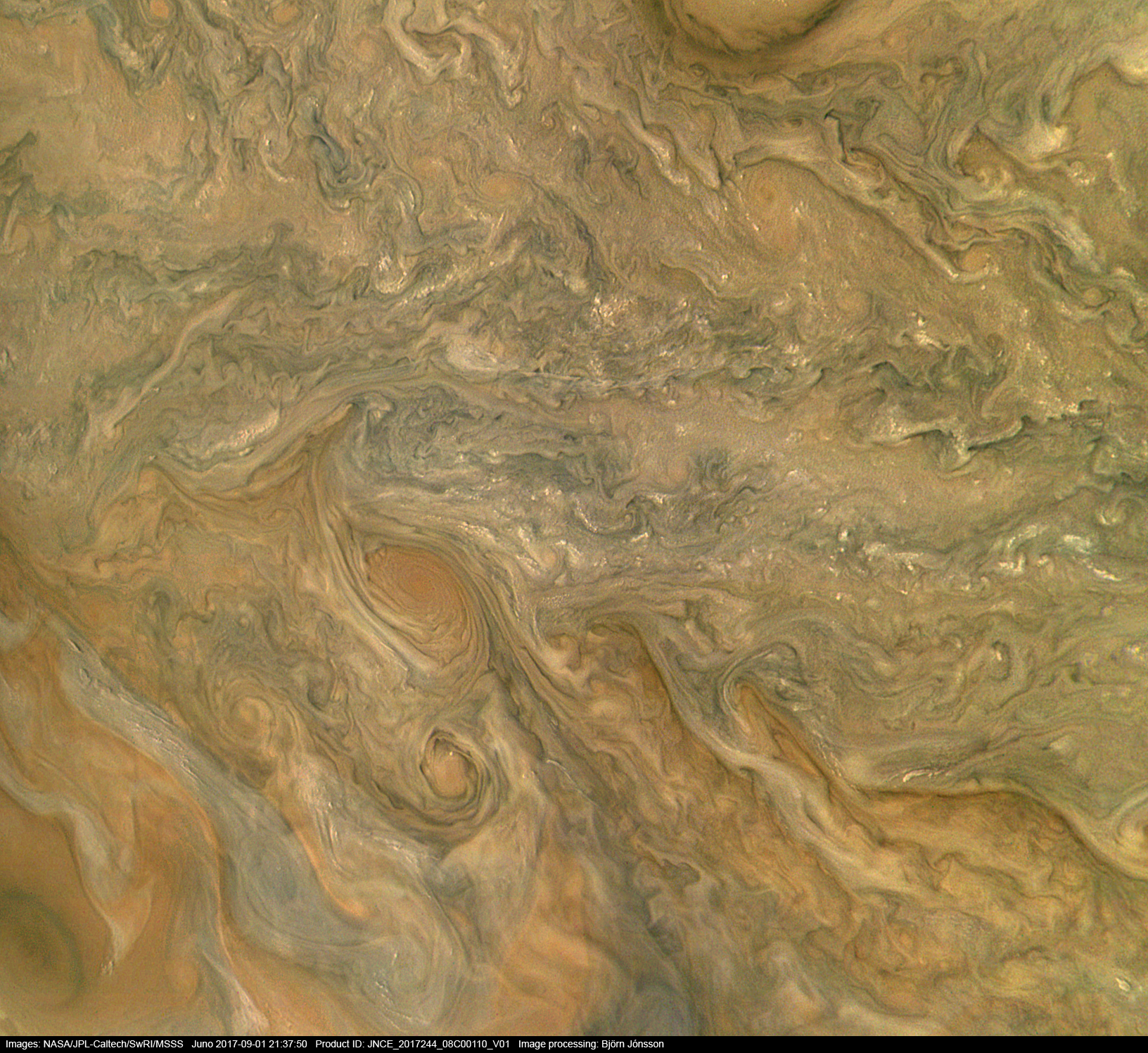 This image has been processed from the raw framelets by removing the effects of global illumination and then enhancing the contrast/color and sharpening small scale features. This reveals lots of details, including cloud shadows and what appears to be vertical relief in the clouds, for example around the vortex left of and slightly below center (this could also be due to differences in cloud colors and brightness but vertical relief is consistent with the fact that the sun illuminates the clouds from the left in the image).