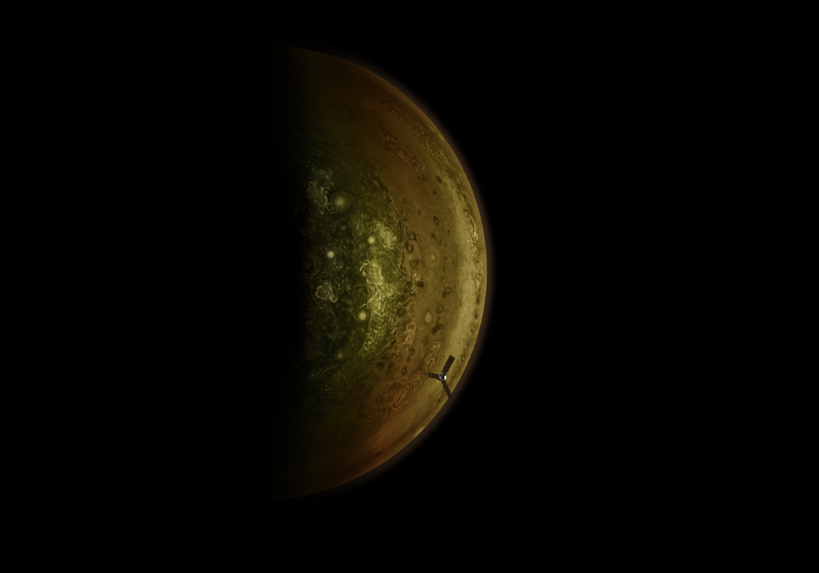 Adjusted de the red, green and blue layers (of JNCE_2016240_00C06184) seperately to get a maximum of detail in the Jovian atmosphere. Would love to be aboard Juno and gaze at these majestic clouds!