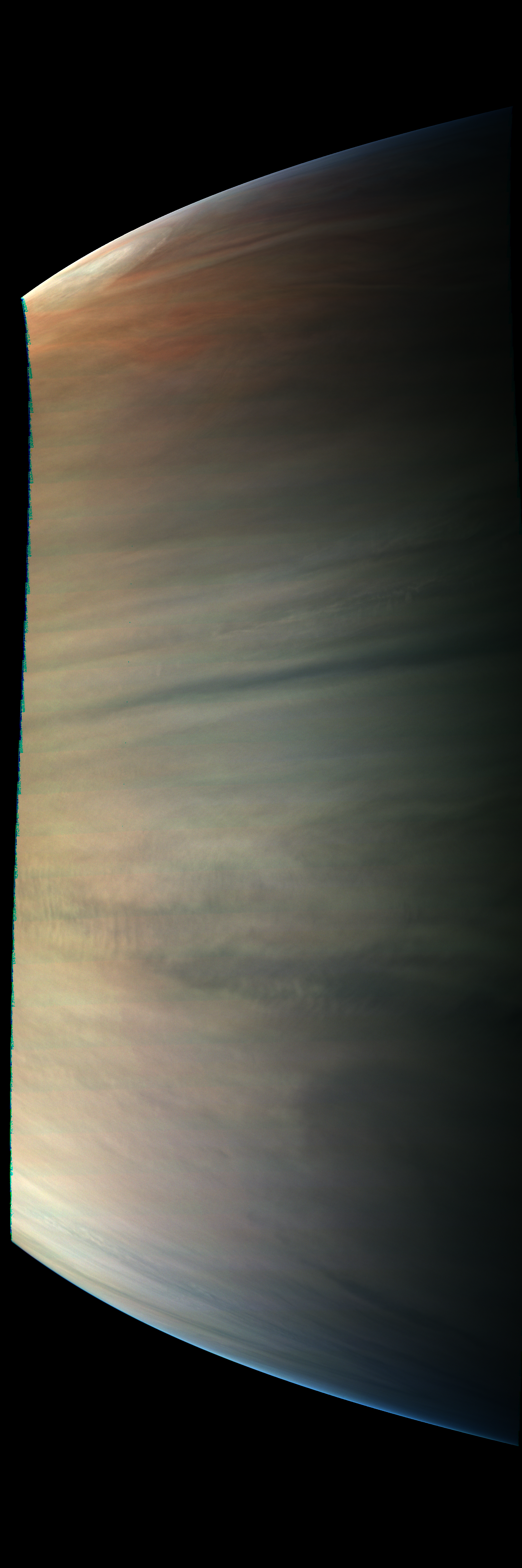 Junocam pixels are 12 bits deep from the camera but are converted to 8 bits inside the instrument using a lossless "companding" table, a process similar to gamma correction, to reduce their size. All Junocam products on the missionjuno website are in this 8-bit form as received on Earth. Scientific users interested in radiometric analysis should use the "RDR" data products archived with the Planetary Data System, which have been converted back to a linear 12-bit scale.