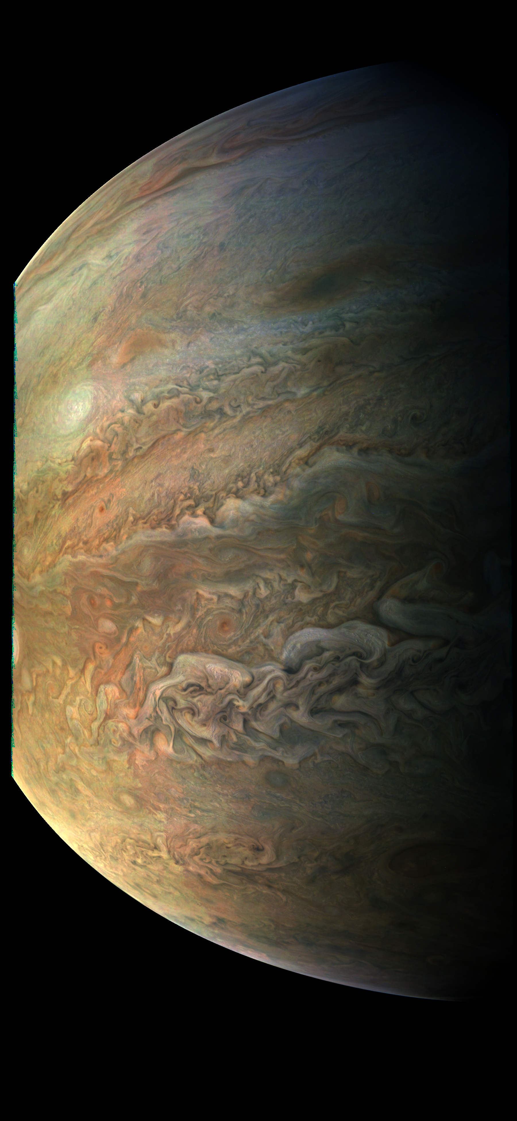 Junocam pixels are 12 bits deep from the camera but are converted to 8 bits inside the instrument using a lossless "companding" table, a process similar to gamma correction, to reduce their size. All Junocam products on the missionjuno website are in this 8-bit form as received on Earth. Scientific users interested in radiometric analysis should use the "RDR" data products archived with the Planetary Data System, which have been converted back to a linear 12-bit scale.