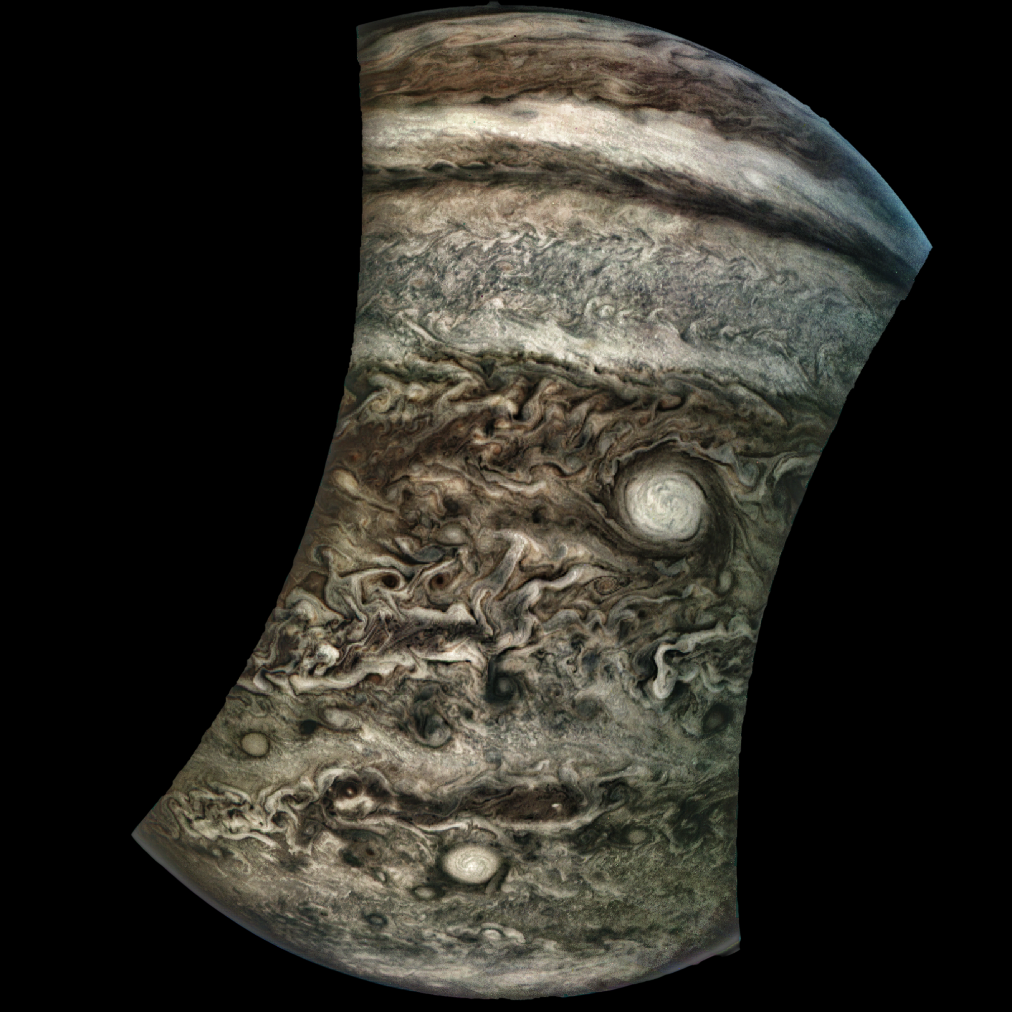 Junocam pixels are 12 bits deep from the camera but are converted to 8 bits inside the instrument using a lossless "companding" table, a process similar to gamma correction, to reduce their size. All Junocam products on the missionjuno website are in this 8-bit form as received on Earth. Scientific users interested in radiometric analysis should use the "RDR" data products archived with the Planetary Data System, which have been converted back to a linear 12-bit scale.