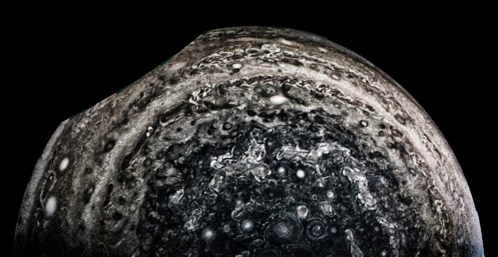 Junocam pixels are 12 bits deep from the camera but are converted to 8 bits inside the instrument using a lossless "companding" table, a process similar to gamma correction, to reduce their size. All Junocam products on the missionjuno website are in this 8-bit form as received on Earth. Scientific users interested in radiometric analysis should use the "RDR" data products archived with the Planetary Data System, which have been converted back to a linear 12-bit scale.