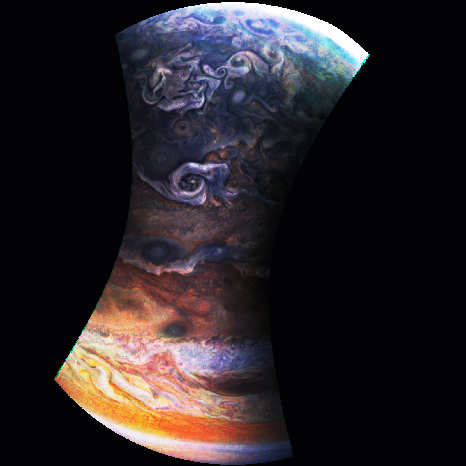 Junocam pixels are 12 bits deep from the camera but are converted to 8 bits inside the instrument using a lossless "companding" table, a process similar to gamma correction, to reduce their size. All Junocam products on the missionjuno website are in this 8-bit form as received on Earth. Scientific users interested in radiometric analysis should use the "RDR" data products archived with the Planetary Data System, which have been converted back to a linear 12-bit scale.
