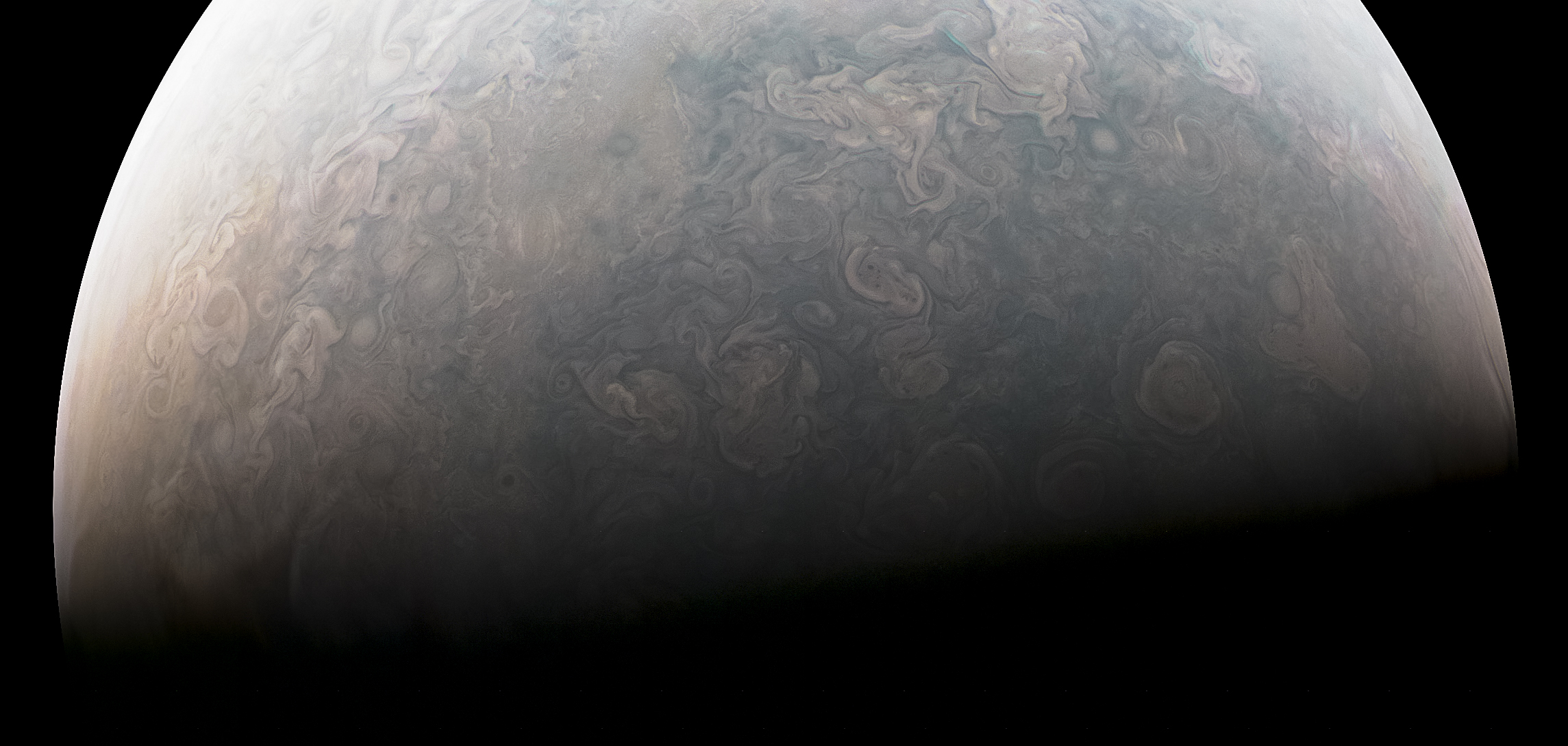 Junocam pixels are 12 bits deep from the camera but are converted to 8 bits inside the instrument using a lossless "companding" table, a process similar to gamma correction, to reduce their size. All Junocam products on the missionjuno website are in this 8-bit form as received on Earth. Scientific users interested in radiometric analysis should use the "RDR" data products archived with the Planetary Data System, which have been converted back to a linear 12-bit scale.