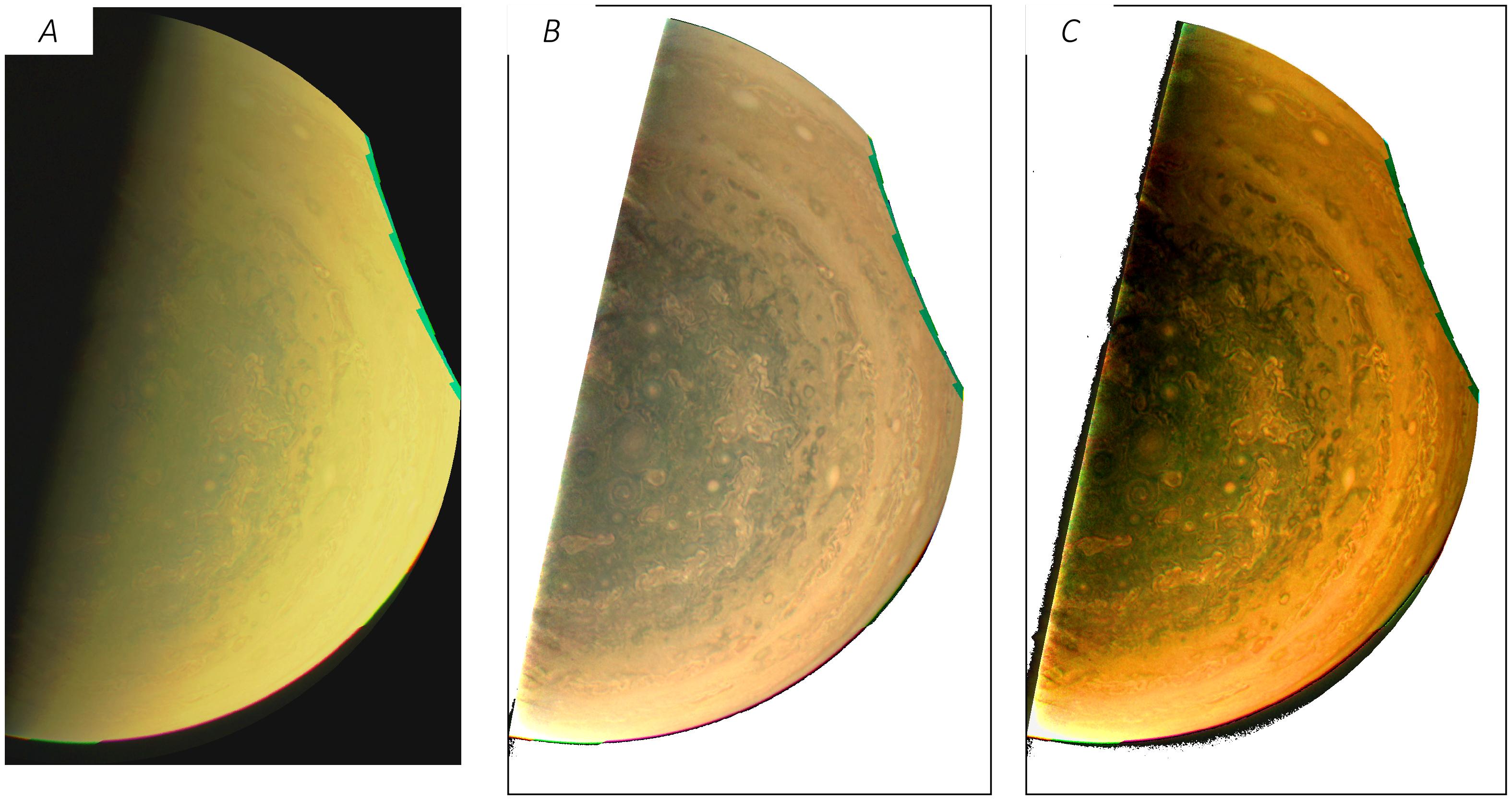 exposure) to try to detect Jupiter’s aurora. We imaged at two different geometries, looking directly down at the pole