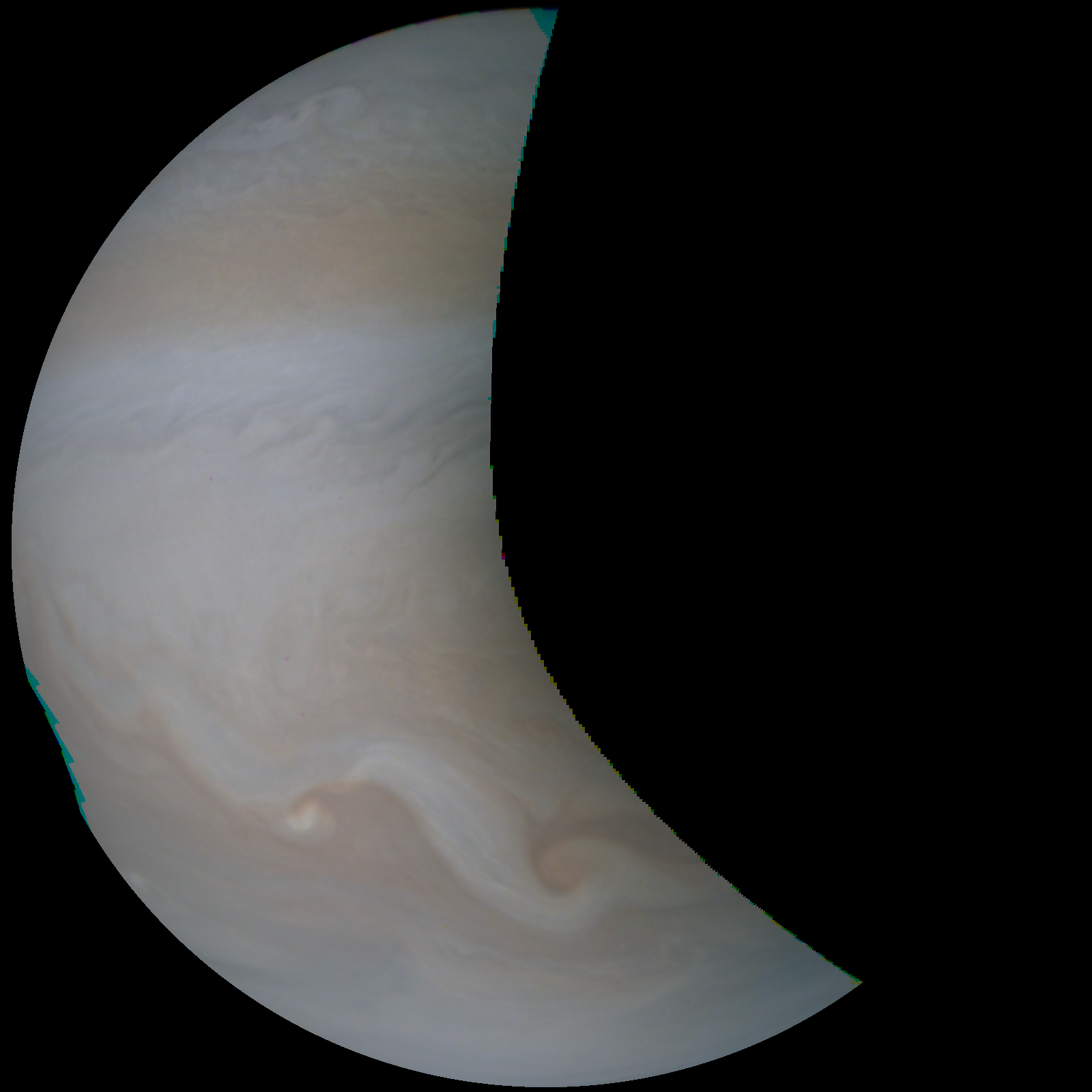 Junocam pixels are 12 bits deep from the camera but are converted to 8 bits inside the instrument using a lossless "companding" table, a process similar to gamma correction, to reduce their size. All Junocam products on the missionjuno website are in this 8-bit form as received on Earth. Scientific users interested in radiometric analysis should use the "RDR" data products archived with the Planetary Data System, which have been converted back to a linear 12-bit scale.