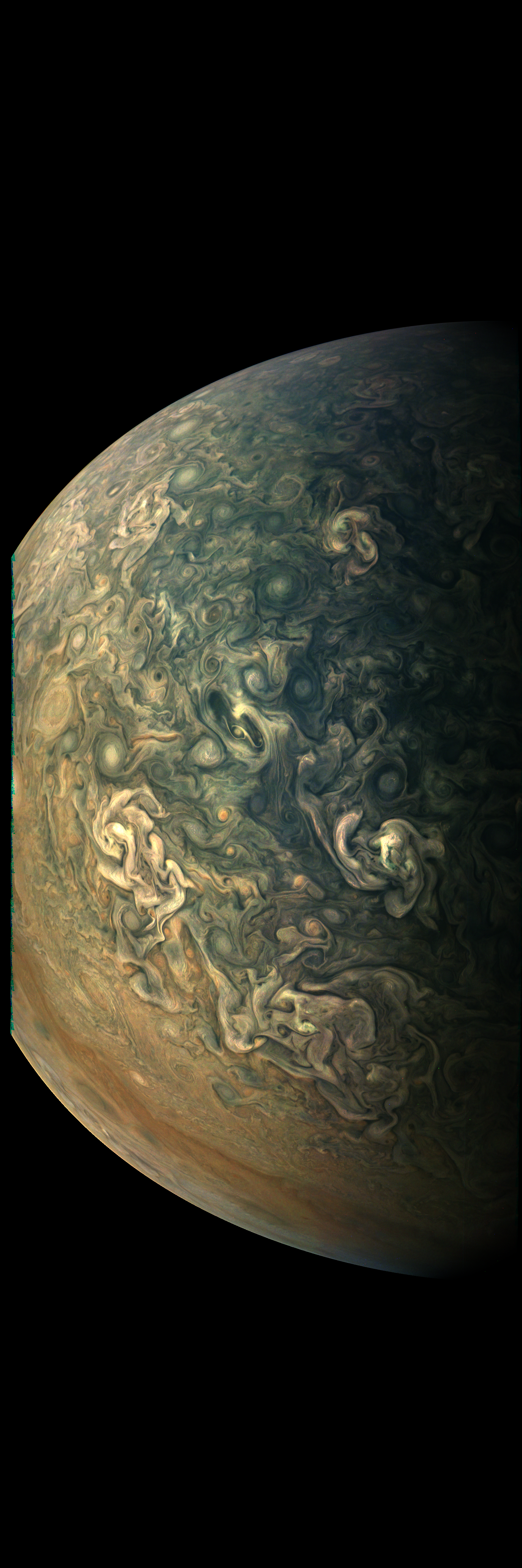 This image has been taken during Juno's Perijove-10 Jupiter flyby. It is rendered directly from the raw in one monolithitic step, except file format conversions.
