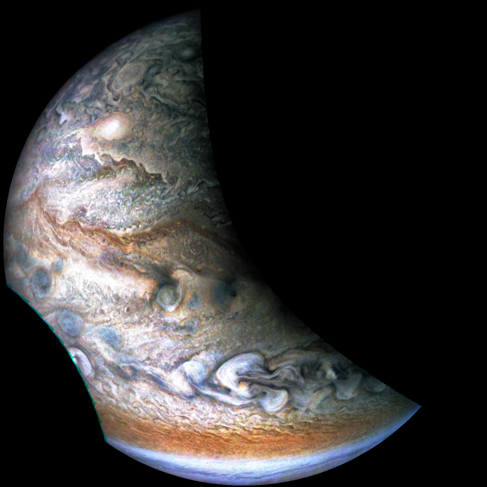 Junocam pixels are 12 bits deep from the camera but are converted to 8 bits inside the instrument using a lossless "companding" table, a process similar to gamma correction, to reduce their size. All Junocam products on the missionjuno website are in this 8-bit form as received on Earth. Scientific users interested in radiometric analysis should use the "RDR" data products archived with the Planetary Data System, which have been converted back to a linear 12-bit scale.