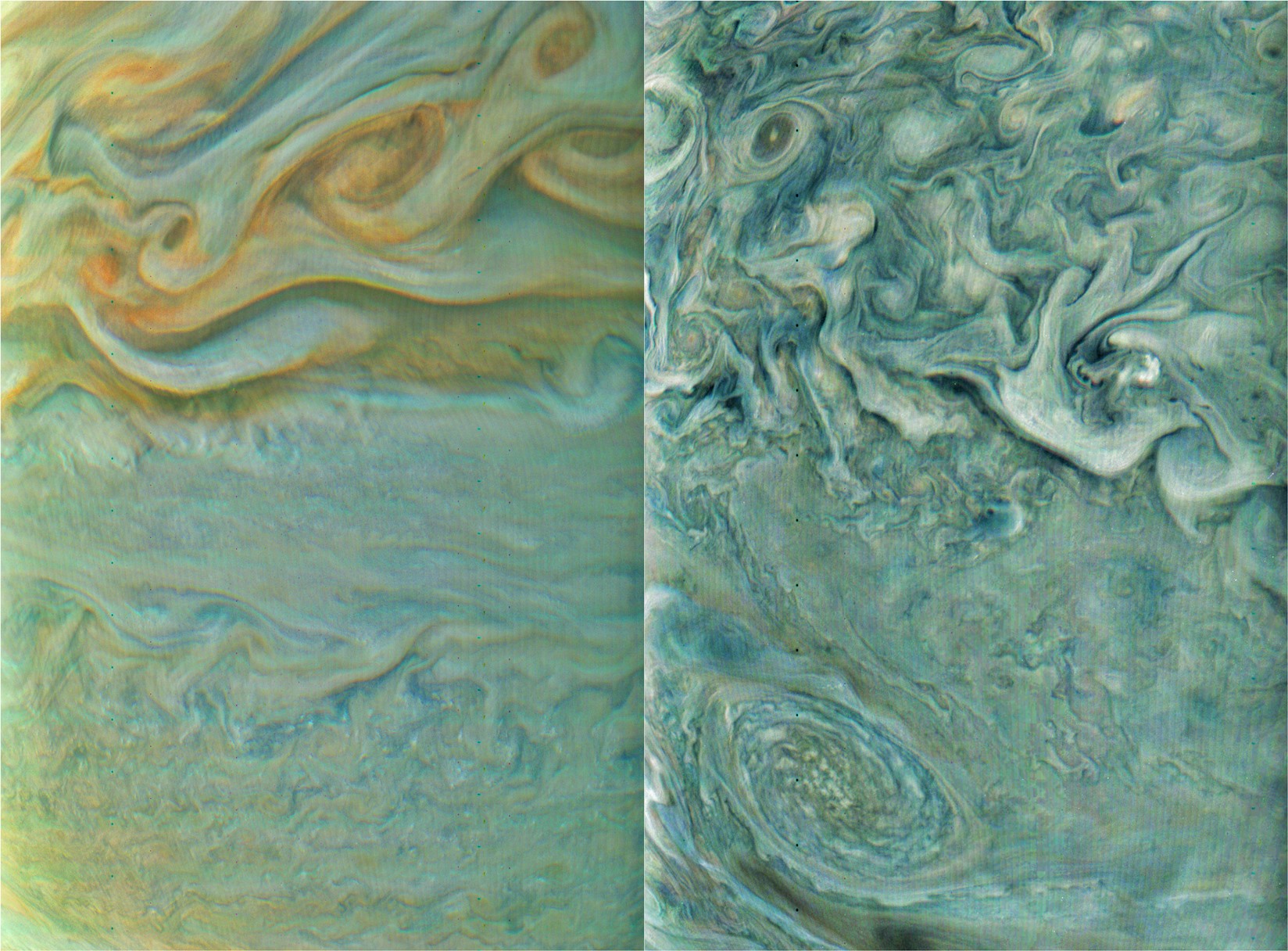 These crops give a first idea of what we may expect from more accurately processed images. From a distance a cloud structure may look smooth. A closer look reveals fine detail. Chaotic structure contain small vortices, and fibroid structures. Those filaments appear to be even more obviously wound around vortices of all sized.