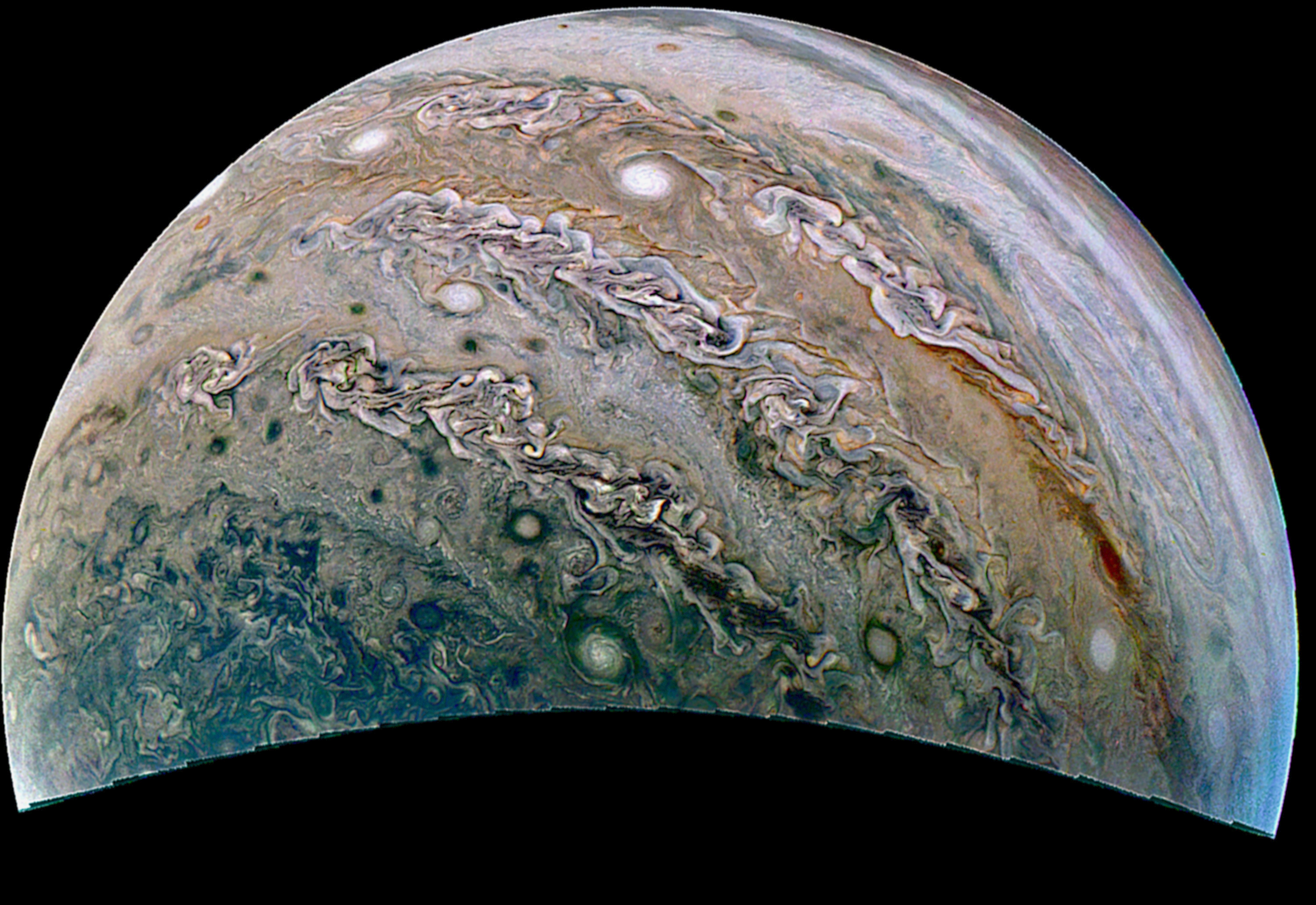 Junocam pixels are 12 bits deep from the camera but are converted to 8 bits inside the instrument using a lossless "companding" table, a process similar to gamma correction, to reduce their size. All Junocam products on the missionjuno website are in this 8-bit form as received on Earth. Scientific users interested in radiometric analysis should use the "RDR" data products archived with the Planetary Data System, which have been converted back to a linear 12-bit scale.