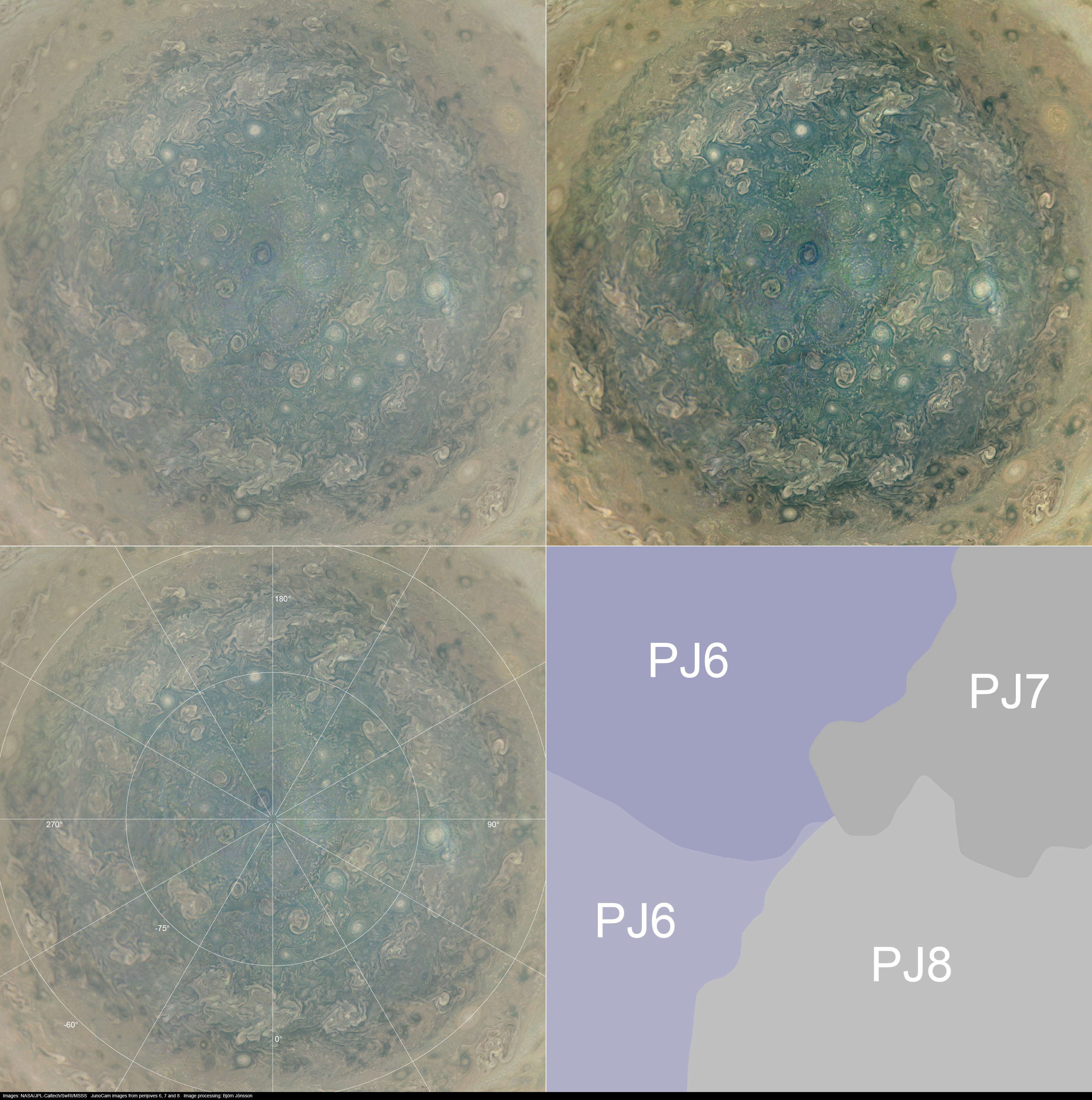 An orthographic mosaic of Jupiter's south polar region. The effects of the varying global illumination have been removed. The color very near the pole might be somewhat inaccurate due to the very low illumination levels near the pole in the original images. This is a mosaic of two perijove 6 images, one perijove 7 image and one perijove 8 image. The five circumpolar cyclones plus the central cyclone are clearly visible. Even though more than three months passed between PJ6 and PJ8 this mosaic should give an accurate idea of the general appearance of the cyclones since they move very slowly and apparently do not change a lot with time. The position of the cyclones during PJ6 was used as a reference when creating the mosaic. In contrast, the areas farther from the pole change a lot more and seams between the different perijoves were originally obvious in the mosaic. These seams have been removed for cosmetic reasons.