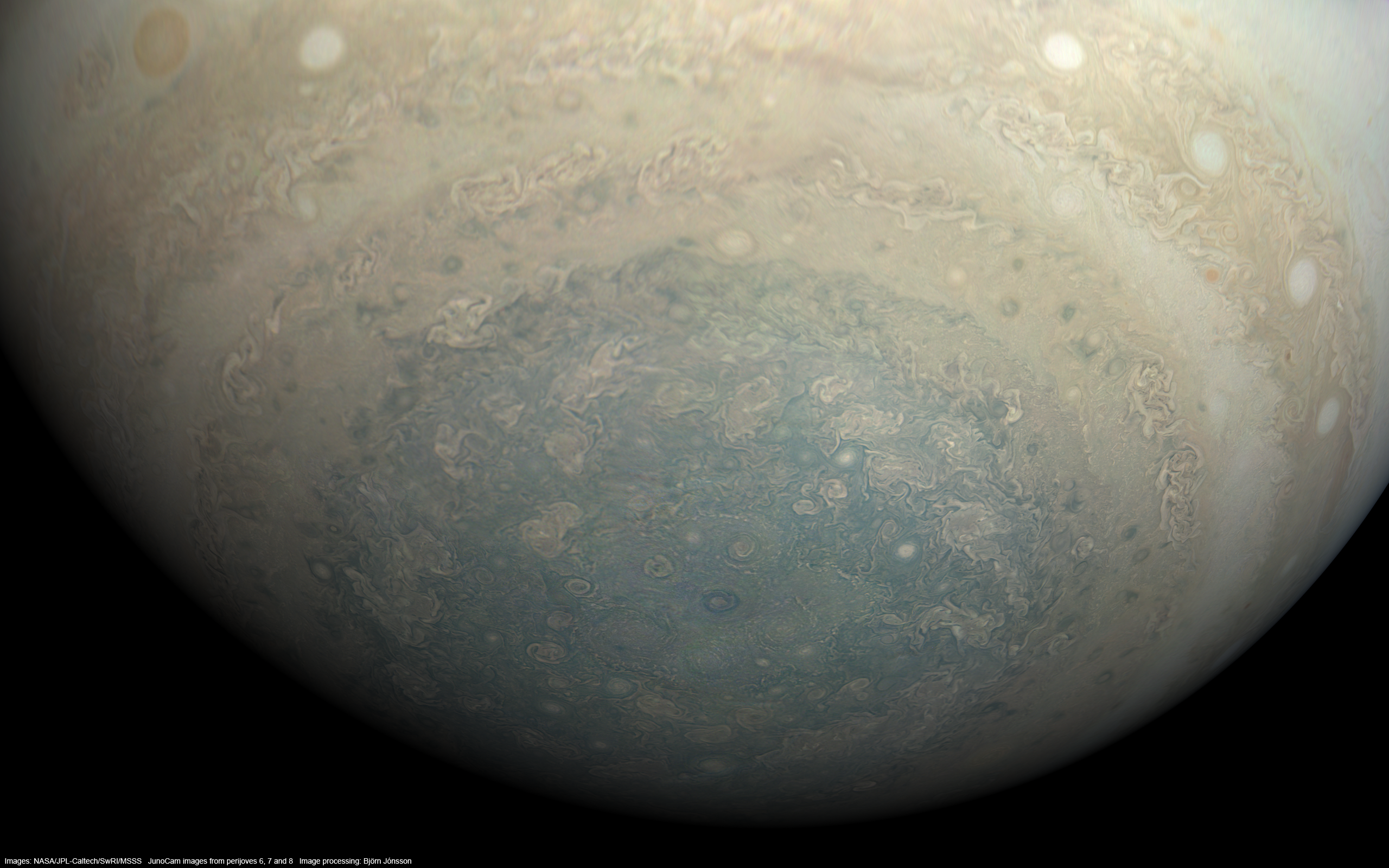 This image is based on JunoCam images obtained during perijoves 6, 7 and 8 that have been mosaicked to cover the entire south polar region. Here the "subspacecraft latitude" is 45 degrees south. This is an approximately true color/contrast view.