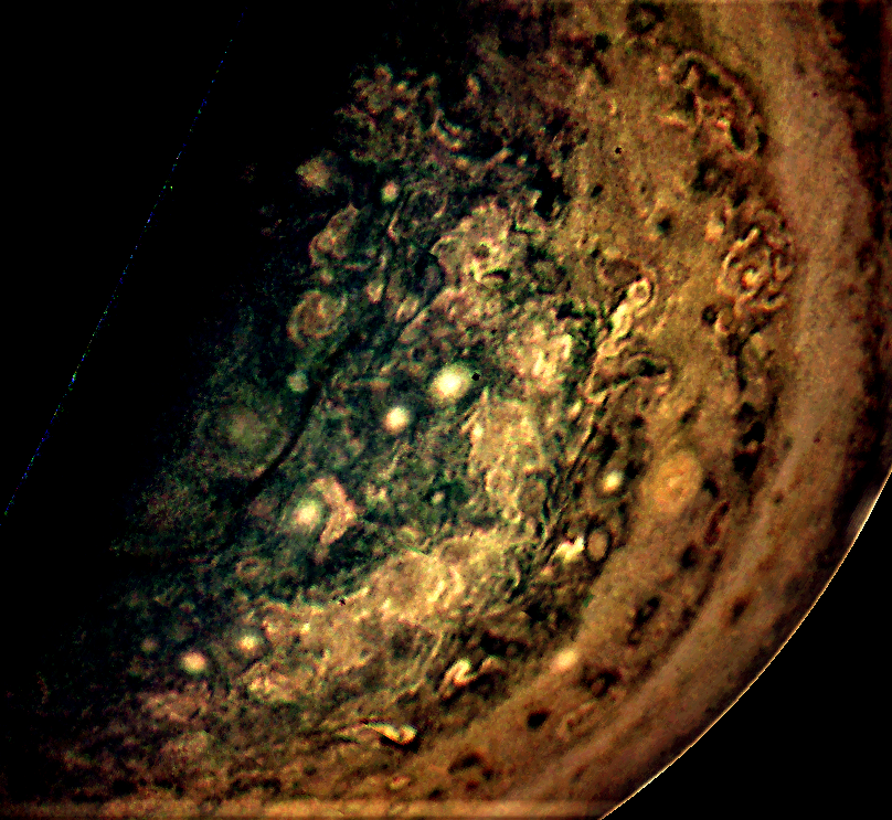 Junocam pixels are 12 bits deep from the camera but are converted to 8 bits inside the instrument using a lossless "companding" table, a process similar to gamma correction, to reduce their size. All Junocam products on the missionjuno website are in this 8-bit form as received on Earth. Scientific users interested in radiometric analysis should use the "RDR" data products archived with the Planetary Data System, which have been converted back to a linear 12-bit scale.