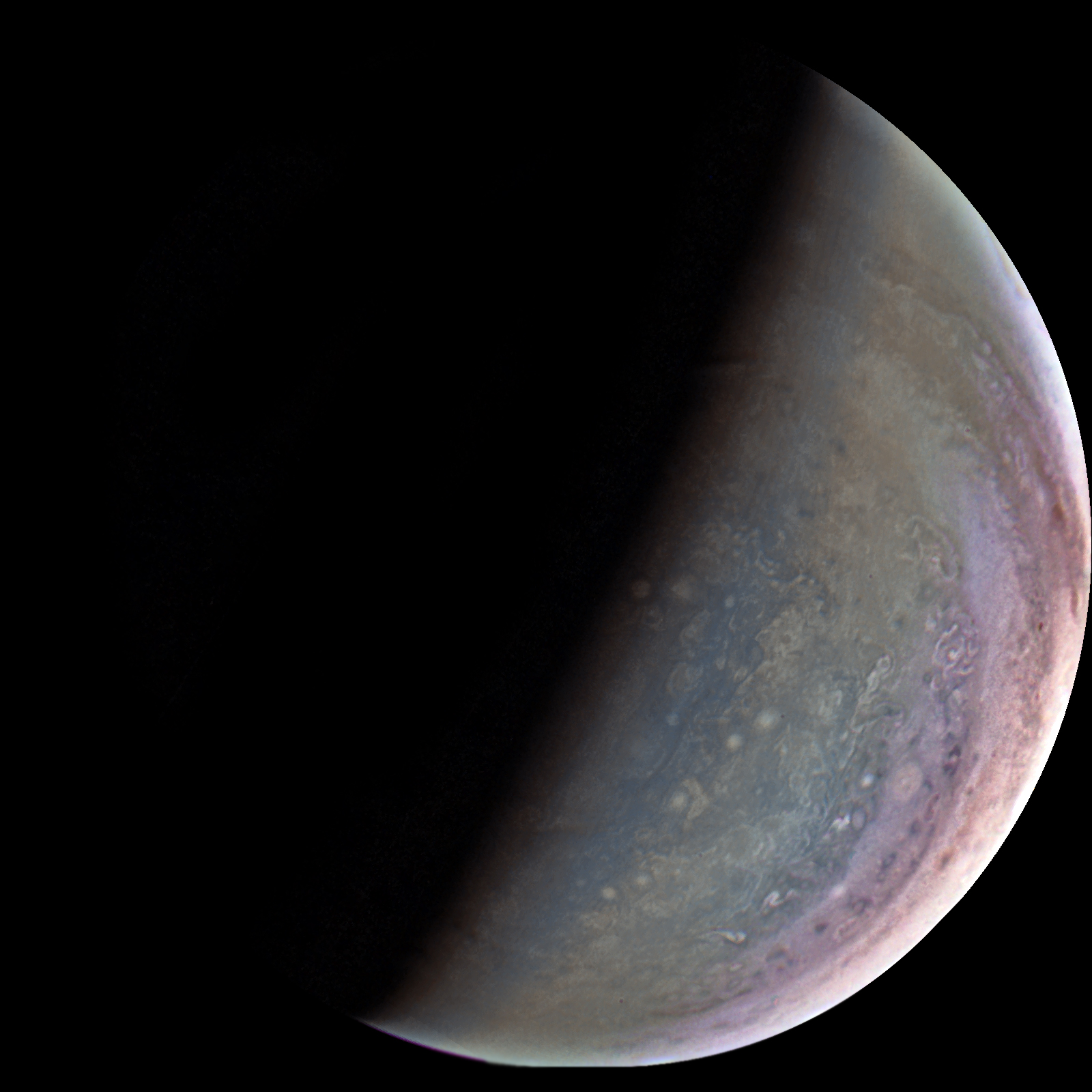 Junocam pixels are 12 bits deep from the camera but are converted to 8 bits inside the instrument using a lossless "companding" table, a process similar to gamma correction, to reduce their size. All Junocam products on the missionjuno website are in this 8-bit form as received on Earth. Scientific users interested in radiometric analysis should use the "RDR" data products archived with the Planetary Data System, which have been converted back to a linear 12-bit scale.