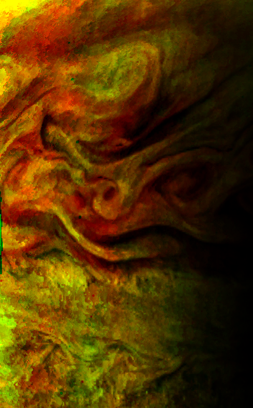 Junocam pixels are 12 bits deep from the camera but are converted to 8 bits inside the instrument using a lossless "companding" table, a process similar to gamma correction, to reduce their size. All Junocam products on the missionjuno website are in this 8-bit form as received on Earth. Scientific users interested in radiometric analysis should use the "RDR" data products archived with the Planetary Data System, which have been converted back to a linear 12-bit scale.