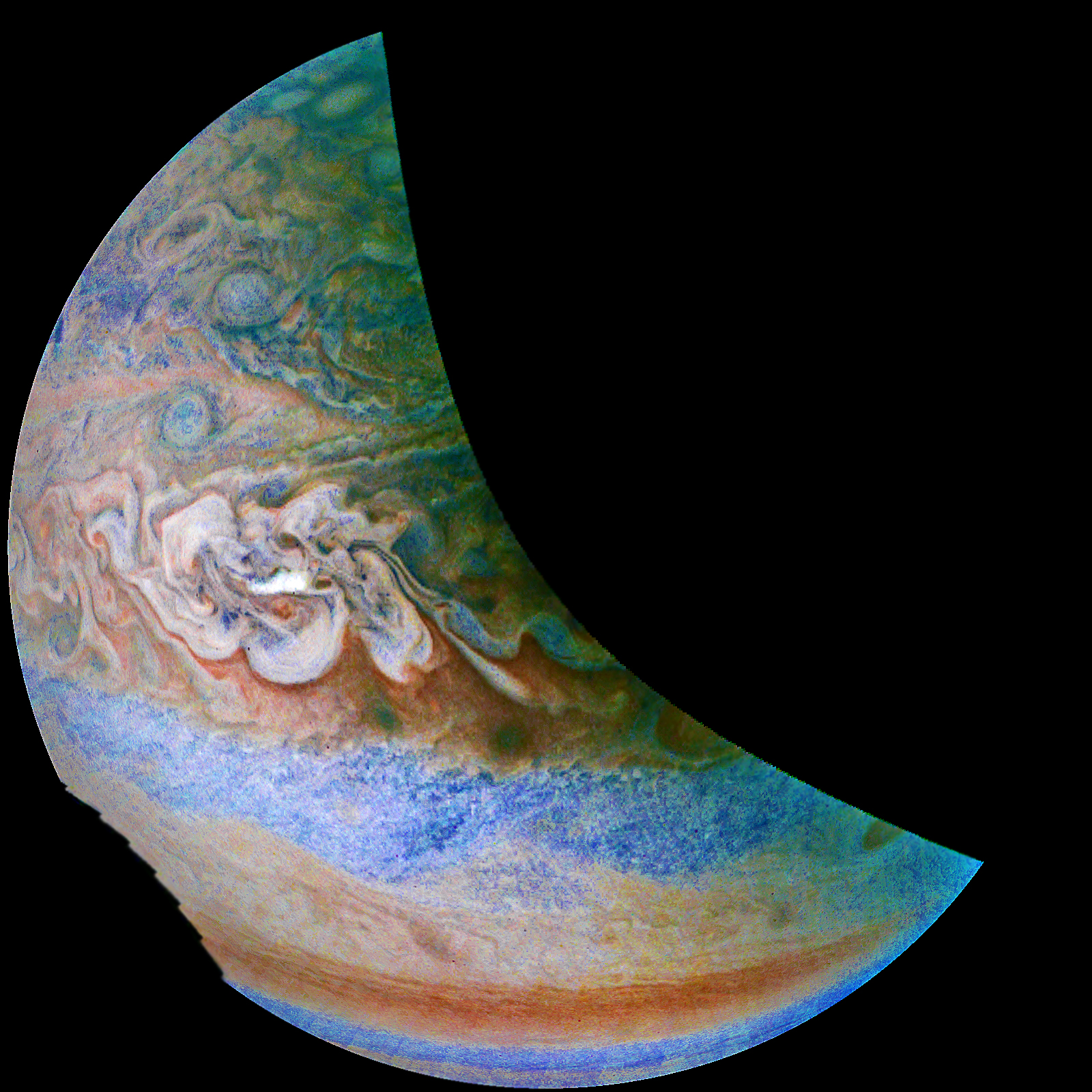 This view of the north north temperate belt shows a giant swirl of colors.
