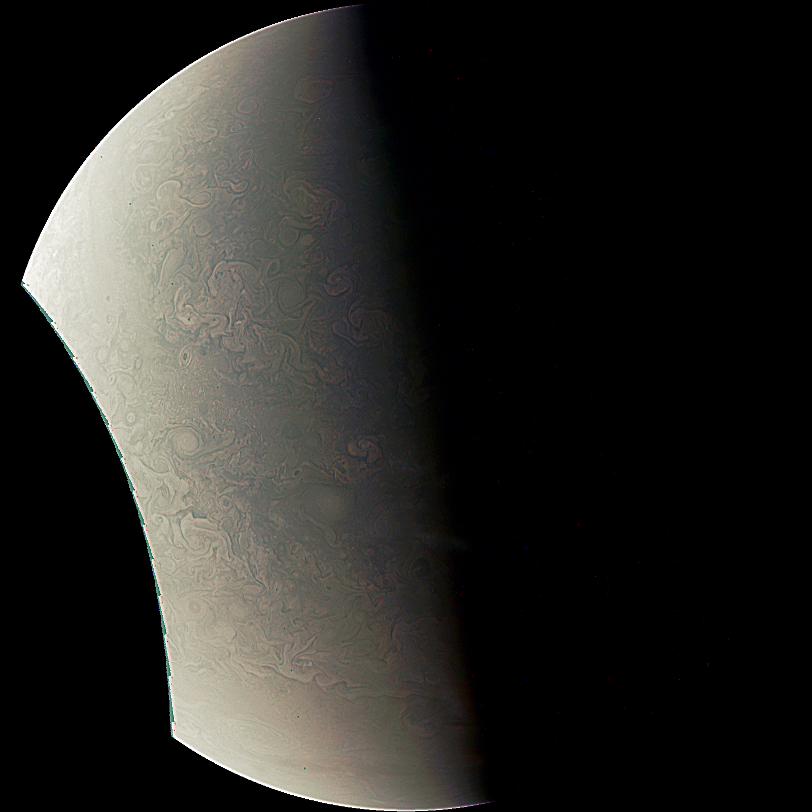 Junocam pixels are 12 bits deep from the camera but are converted to 8 bits inside the instrument using a lossless "companding" table, a process similar to gamma correction, to reduce their size. All Junocam products on the missionjuno website are in this 8-bit form as received on Earth. Scientific users interested in radiometric analysis should use the "RDR" data products archived with the Planetary Data System, which have been converted back to a linear 12-bit scale.