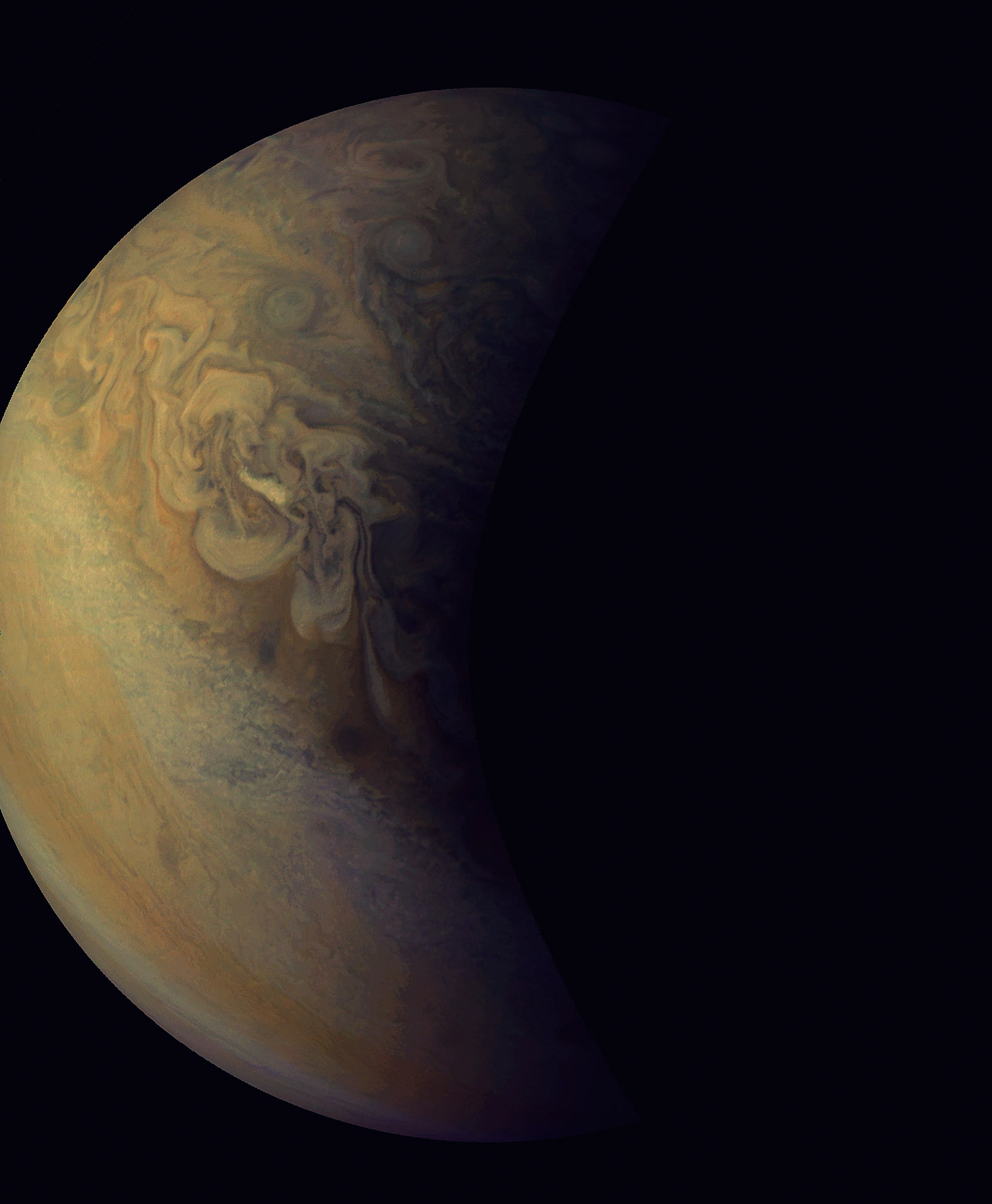 Junocam pixels are 12 bits deep from the camera but are converted to 8 bits inside the instrument using a lossless "companding" table, a process similar to gamma correction, to reduce their size. All Junocam products on the missionjuno website are in this 8-bit form as received on Earth. Scientific users interested in radiometric analysis should use the "RDR" data products archived with the Planetary Data System, which have been converted back to a linear 12-bit scale.
