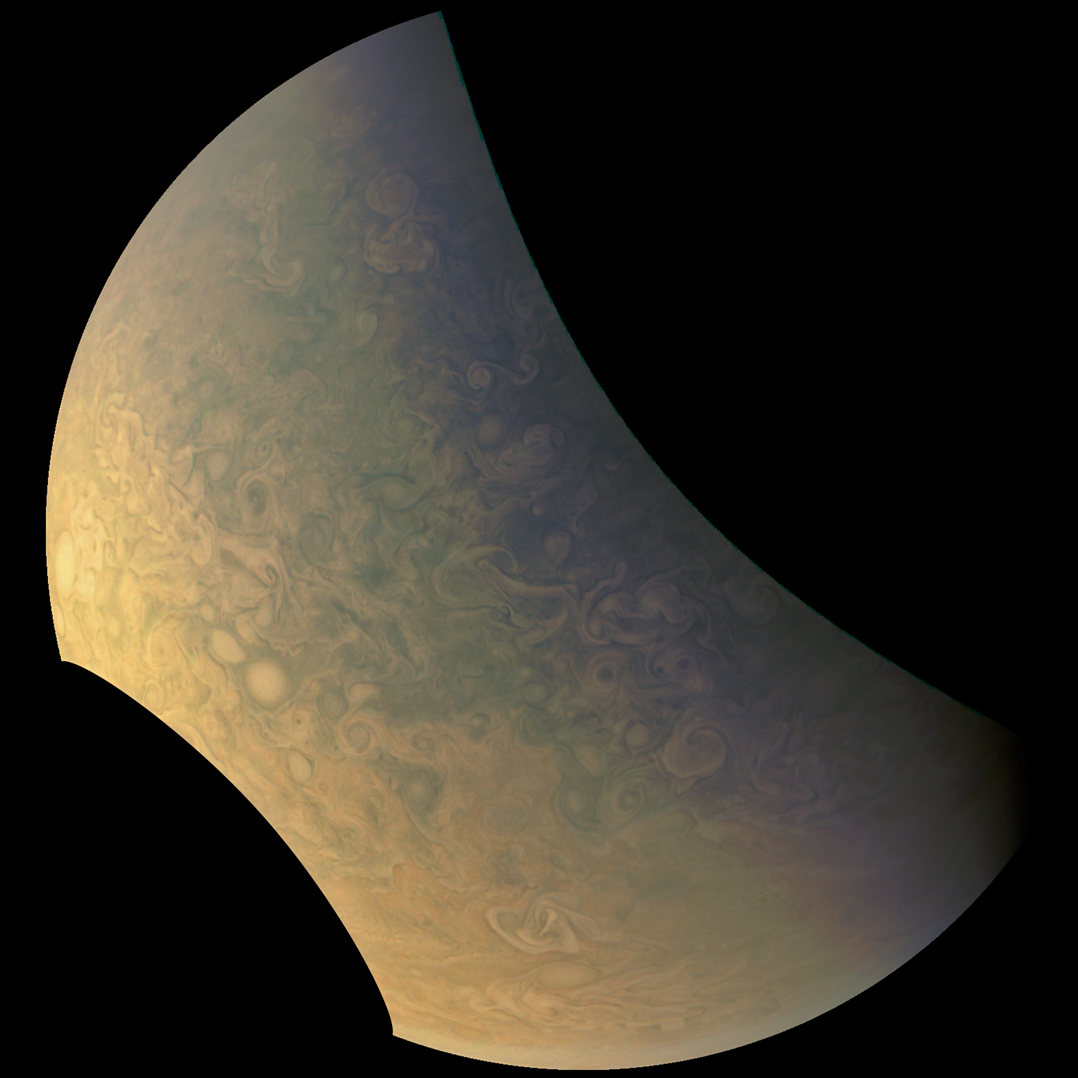 Junocam pixels are 12 bits deep from the camera but are converted to 8 bits inside the instrument using a lossless "companding" table, a process similar to gamma correction, to reduce their size. All Junocam products on the missionjuno website are in this 8-bit form as received on Earth. Scientific users interested in radiometric analysis should use the "RDR" data products archived with the Planetary Data System, which have been converted back to a linear 12-bit scale.