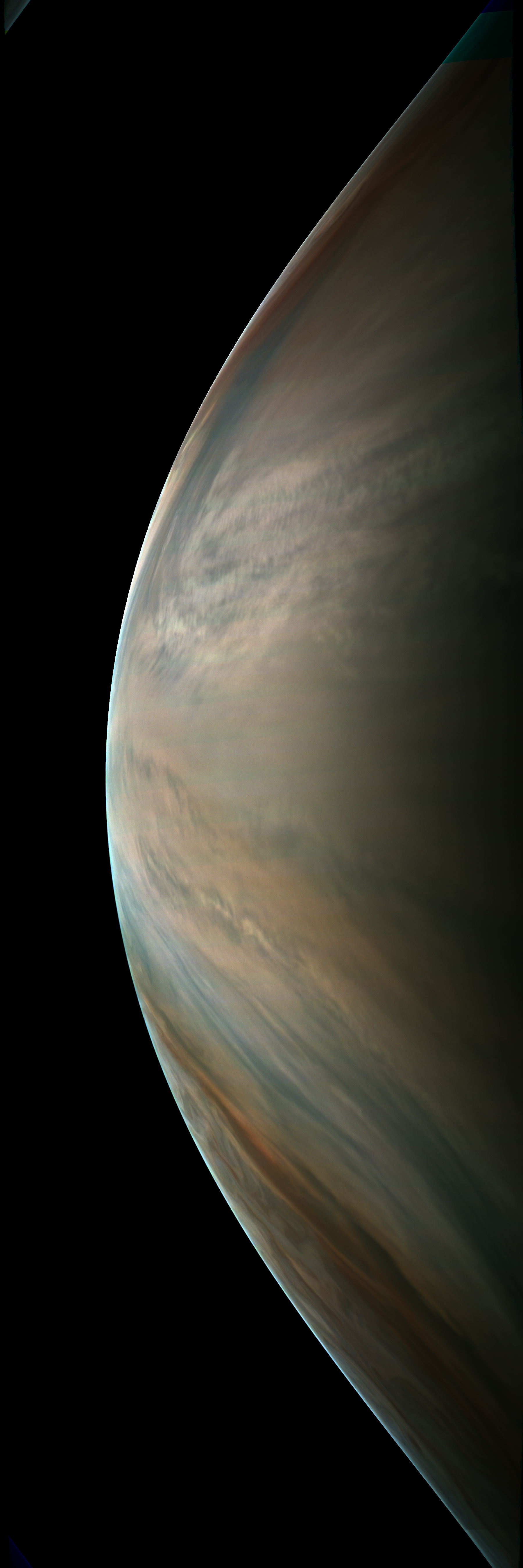 The raw has been decompanded, approximately radiometrically corrected, reprojected to a cylindrical FOV of 60x180 degrees using SPICE kernels and a Jupiter spheroid model, illumination-adjusted by a slightly modified best-fit illumination model derived from PJ6 images, gamma-stretched with gamma=4 relative to radiometric data, and mostly patched from repetitive camera artifacts.