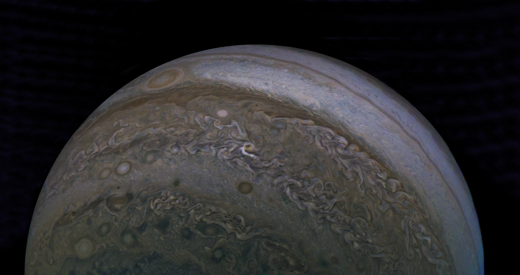 Junocam pixels are 12 bits deep from the camera but are converted to 8 bits inside the instrument using a lossless "companding" table, a process similar to gamma correction, to reduce their size. All Junocam products on the missionjuno website are in this 8-bit form as received on Earth. Scientific users interested in radiometric analysis should use the "RDR" data products archived with the Planetary Data System, which have been converted back to a linear 12-bit scale.
