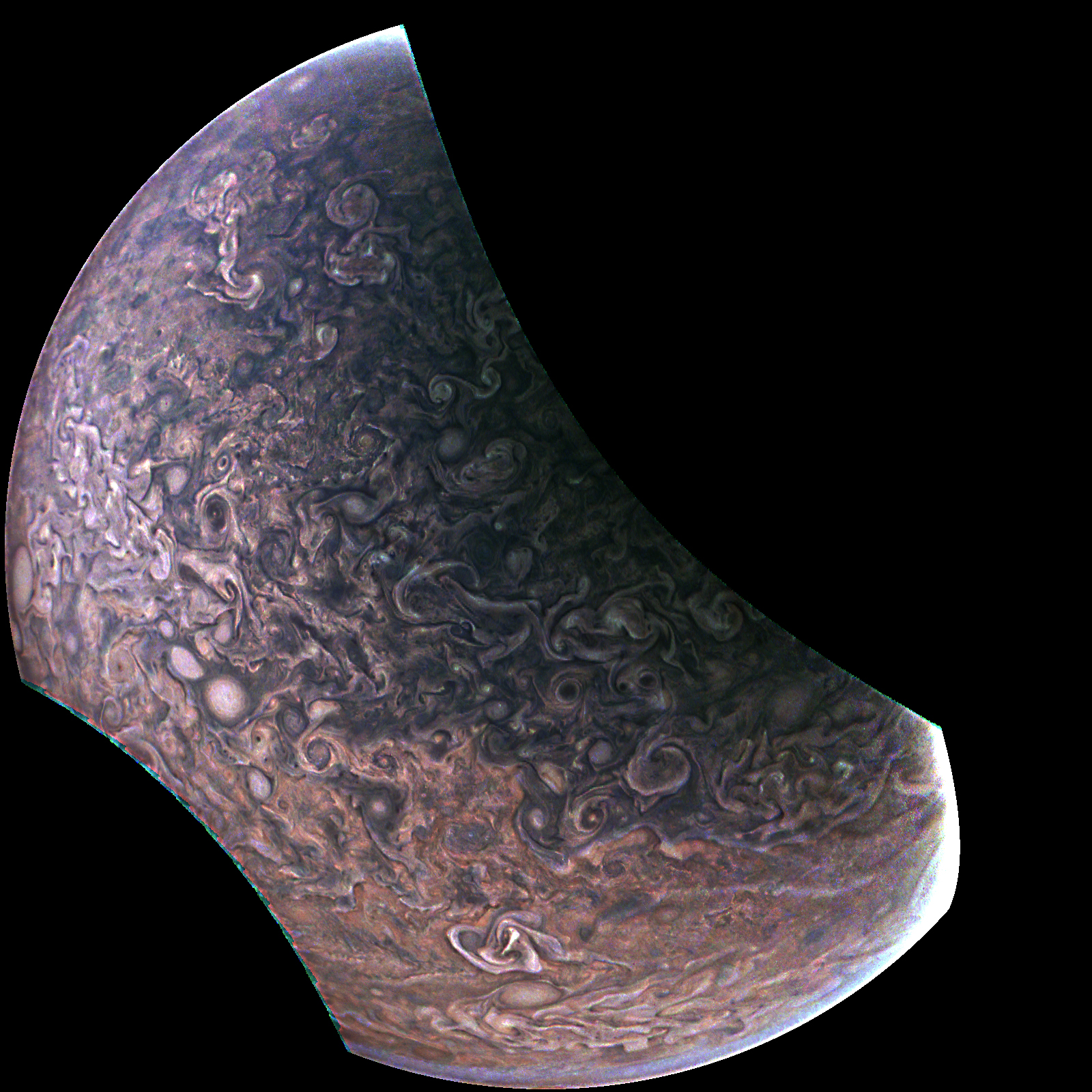 Junocam pixels are 12 bits deep from the camera but are converted to 8 bits inside the instrument using a lossless "companding" table, a process similar to gamma correction, to reduce their size. All Junocam products on the missionjuno website are in this 8-bit form as received on Earth. Scientific users interested in radiometric analysis should use the "RDR" data products archived with the Planetary Data System, which have been converted back to a linear 12-bit scale.
