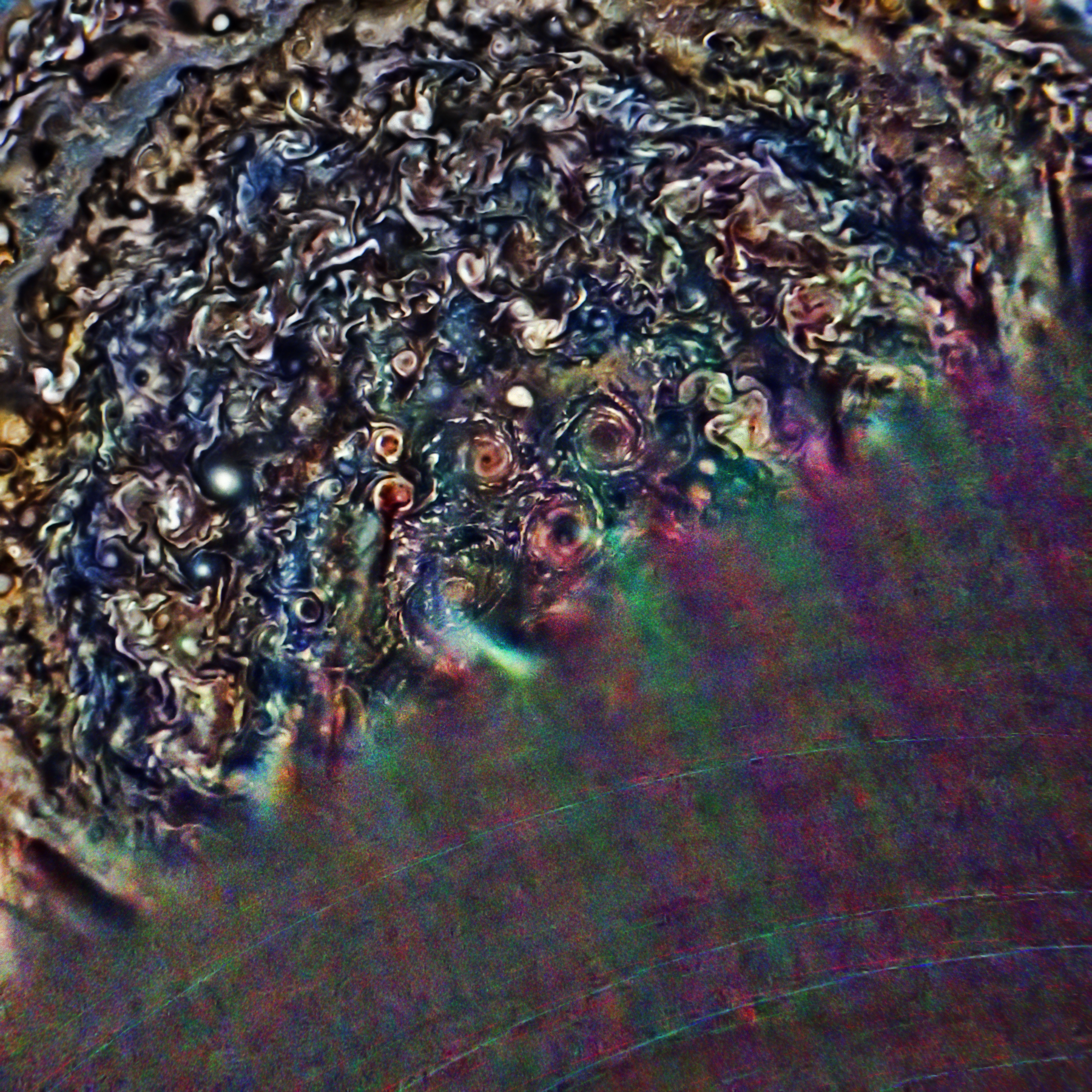 The raw PJ11 JunoCam images #31. #32, #33, and #35 have been rendered into south polar maps, filtered with a specifically designed context-sensitive hipass filter, stacked, denoised, and enhanced.