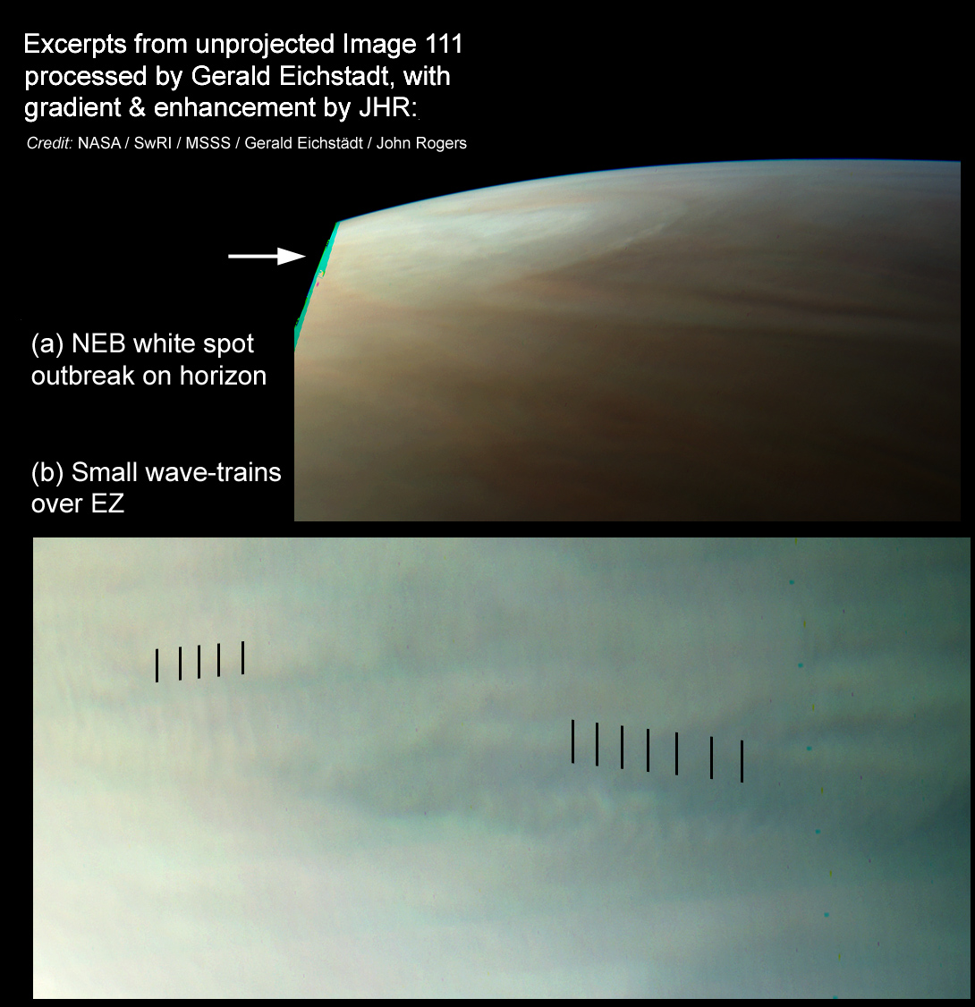 Image 111 was taken at closest approach from an altitude of only 4147 km, so in the central region is the highest-resolution image ever taken of Jupiter. Here it shows two wave-trains in the clouds of the Equatorial Zone , similar to wave-trains of ~200 km wavelength which have been imaged by previous spacecraft. This image also shows the white spot in northern NEB, on the horizon. (More about all these features is on our web site at: https://www.britastro.org/node/7982 .) --John Rogers.