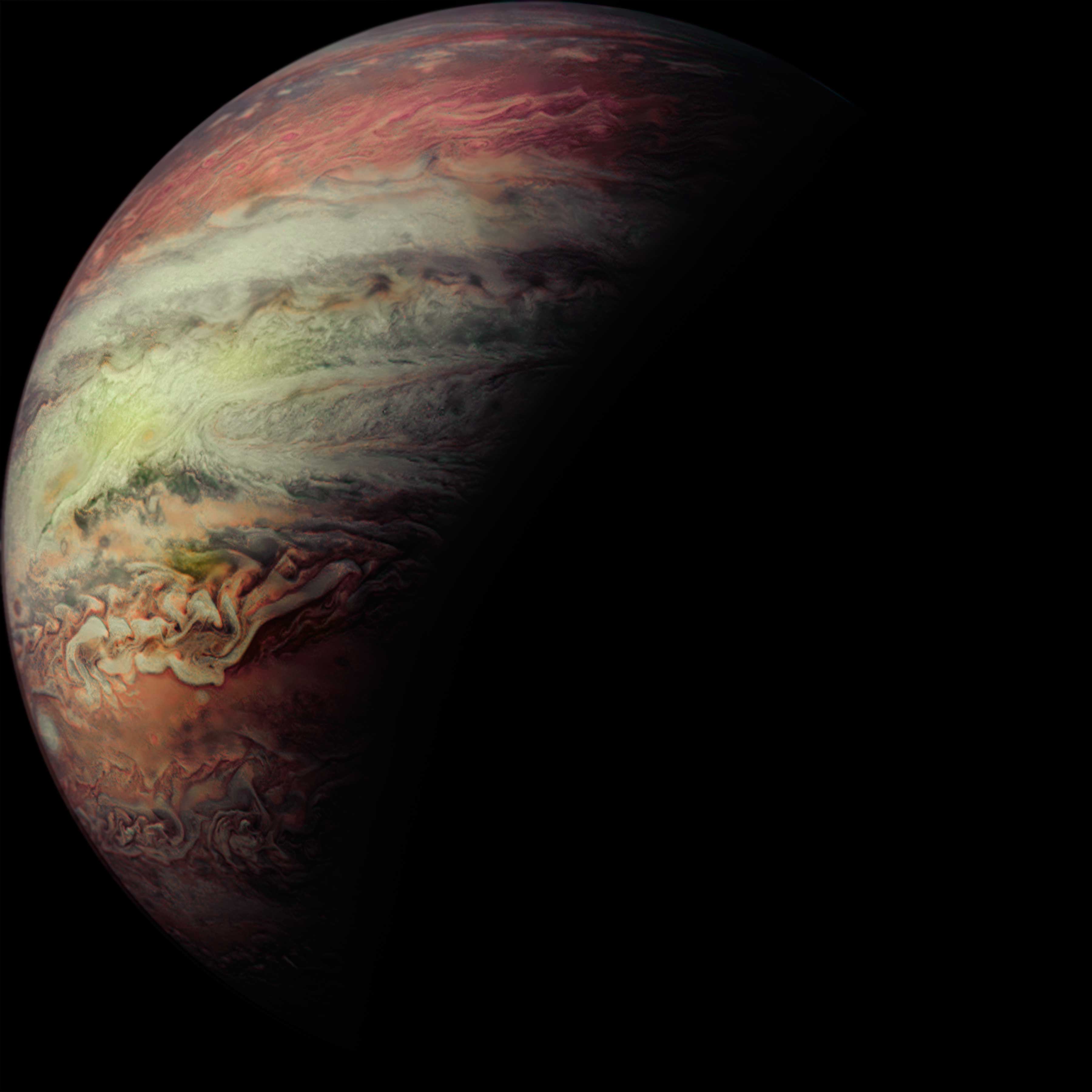 Junocam pixels are 12 bits deep from the camera but are converted to 8 bits inside the instrument using a lossless "companding" table, a process similar to gamma correction, to reduce their size. All Junocam products on the missionjuno website are in this 8-bit form as received on Earth. Scientific users interested in radiometric analysis should use the "RDR" data products archived with the Planetary Data System, which have been converted back to a linear 12-bit scale.