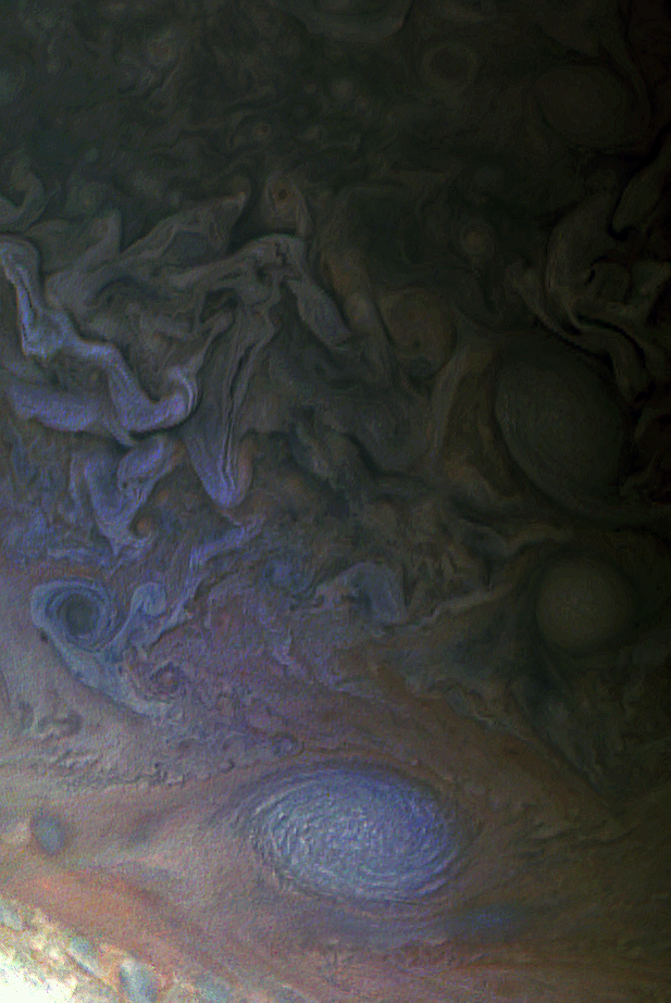 Quick colour adjustment and other miscellaneous processing of the oval storm and some turbulence on image #84 from Perijove 12
