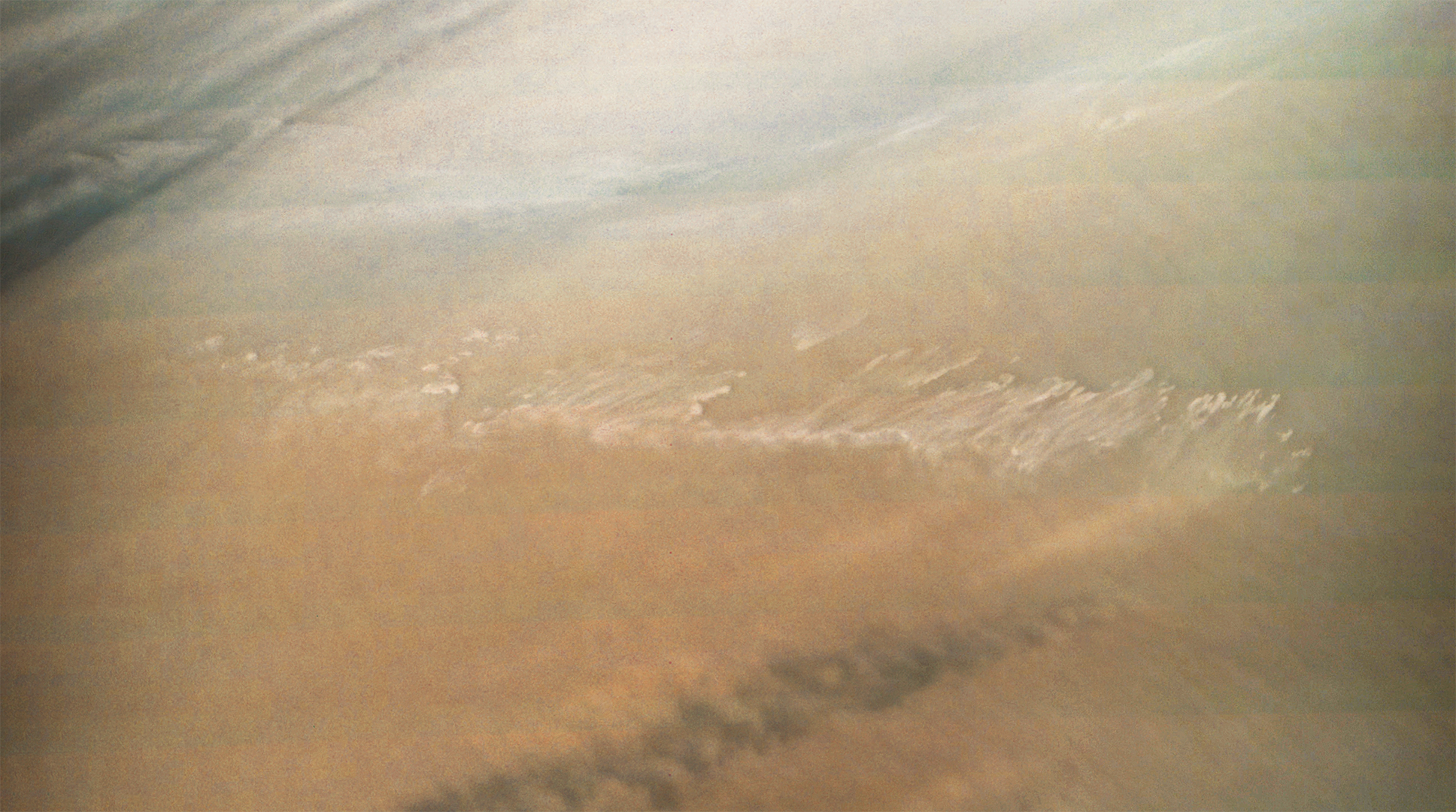 We have a methane filter, included for the polar science investigation, that is almost at the limits of our detector’s wavelength range. To get enough photons for an image we need to use a very long exposure. In some images this results in scattered light in the image. For science purposes we will simply crop out the portions of the image that include this artifact. Work is in progress to determine exactly what conditions cause stray light problems so that this can be minimized for future imaging.