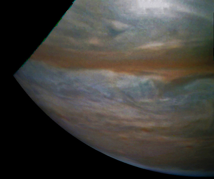 Junocam pixels are 12 bits deep from the camera but are converted to 8 bits inside the instrument using a lossless "companding" table, a process similar to gamma correction, to reduce their size. All Junocam products on the missionjuno website are in this 8-bit form as received on Earth. Scientific users interested in radiometric analysis should use the "RDR" data products archived with the Planetary Data System, which have been converted back to a linear 12-bit scale.