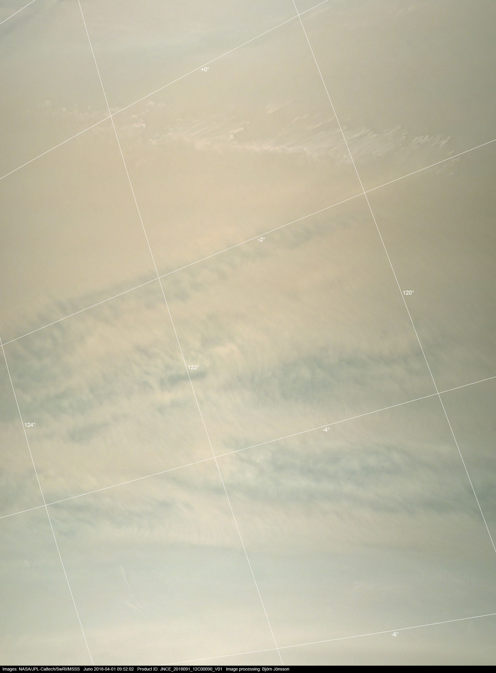 An approximately true color/contrast version of a section of PJ_12 image 90. A latitude/longitude grid is included. This makes it more easy to identify the location and orientation of the mesoscale waves in the enhanced version of this image.