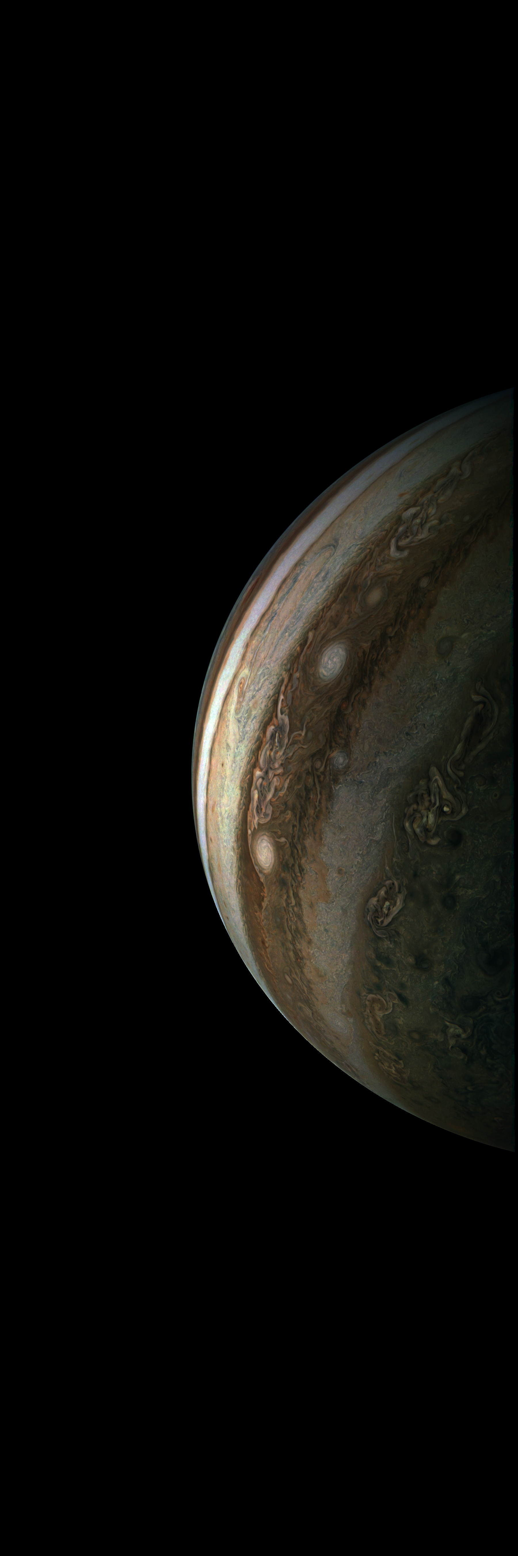 Junocam pixels are 12 bits deep from the camera but are converted to 8 bits inside the instrument using a lossless "companding" table, a process similar to gamma correction, to reduce their size. All Junocam products on the missionjuno website are in this 8-bit form as received on Earth. Scientific users interested in radiometric analysis should use the "RDR" data products archived with the Planetary Data System, which have been converted back to a linear 12-bit scale.