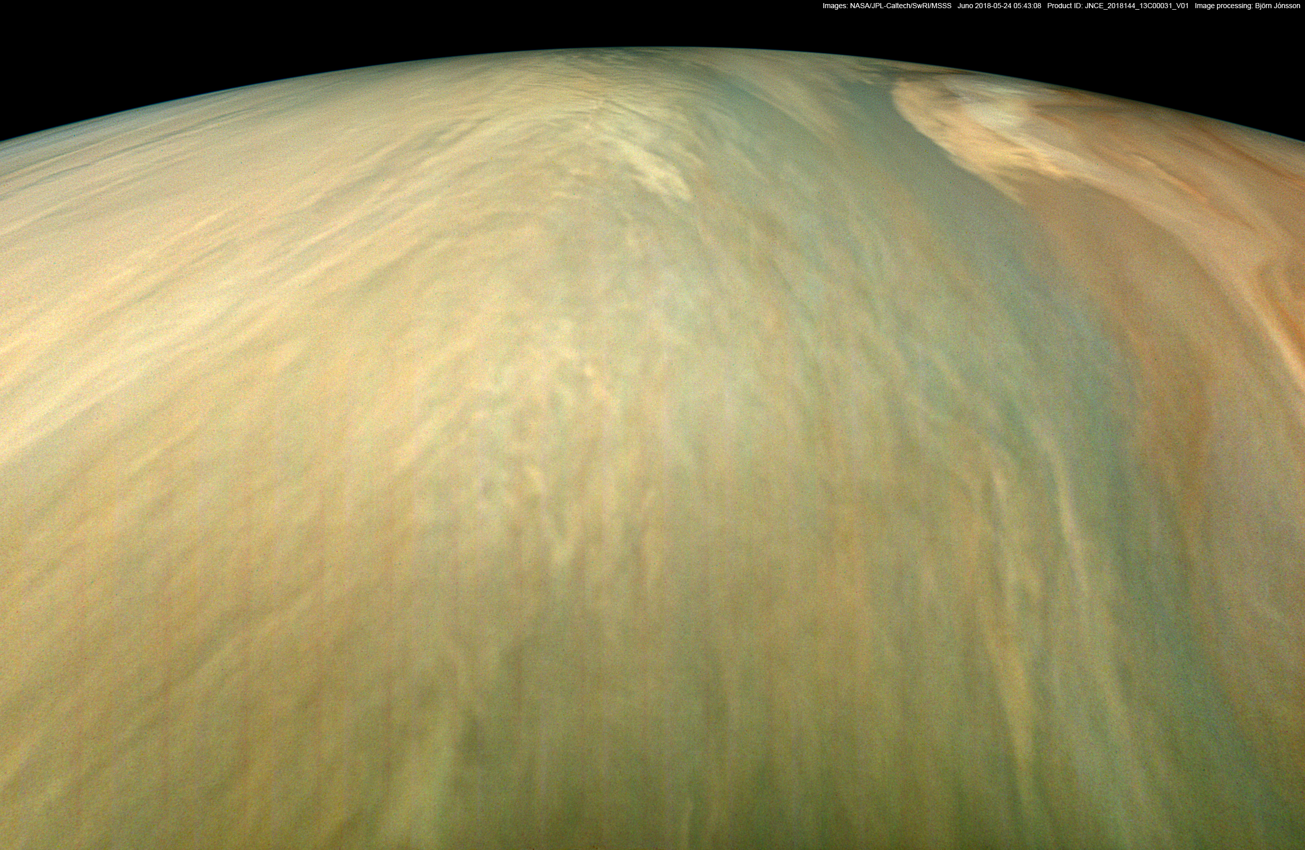 An image processed from the raw image PJ13_31 framelets. The color and contrast is exaggerated in this image and various details have been sharpened. The faint and fuzzy parallel vertical lines visible in the lower half of the image are an artifact of the processing.