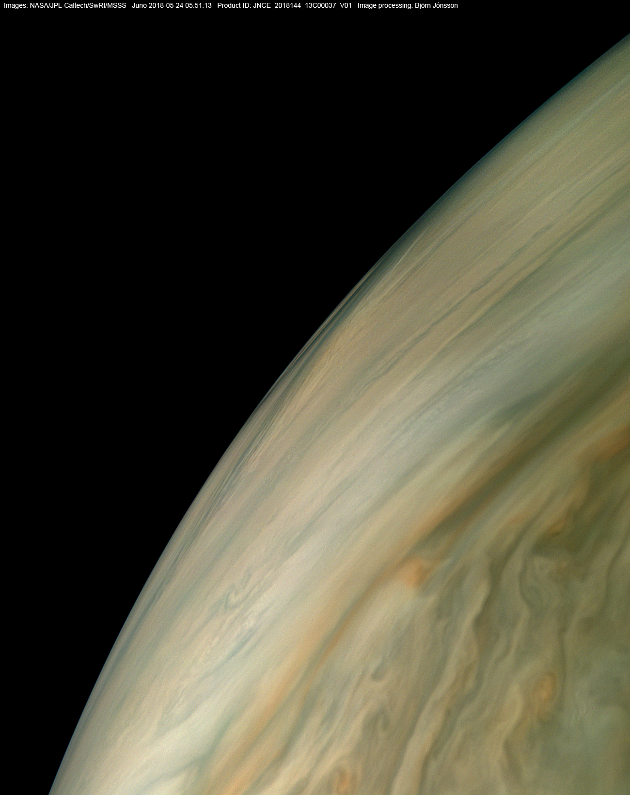 An image processed from the raw image PJ13_37 framelets. The color and contrast is exaggerated in this image and small scale details have been sharpened.