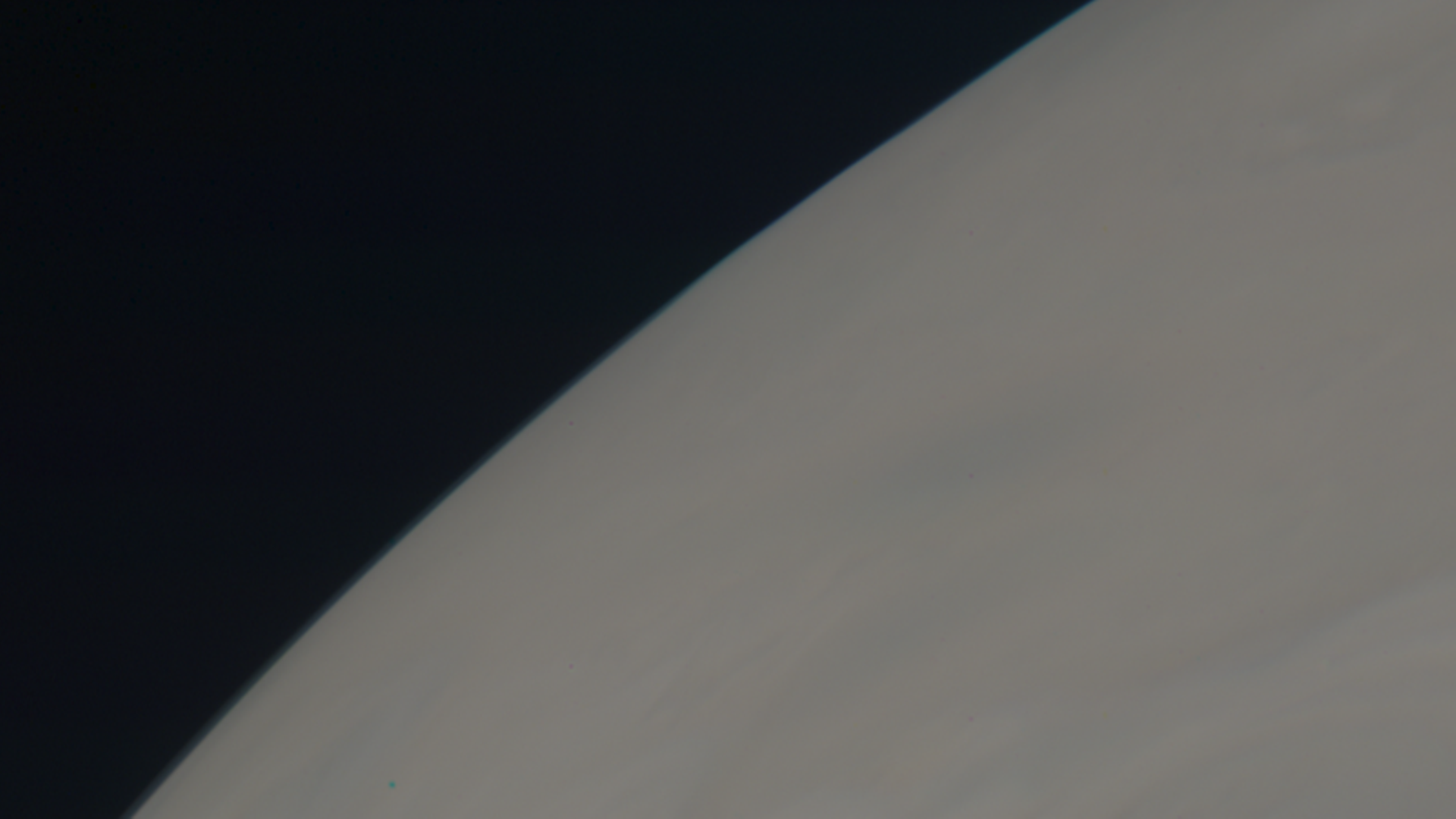 The lower left of the limb shows a considerably thicker transparent atmosphere layer in this image than the upper right limb. This image is only moderately processed, without patching camera blemish. Neither trajectory data nor shape model have been applied. The thick transparent atmosphere layer in some parts is obvious also in the raws. Camera motion blur due to vibrations is unlikely, since the transition can be observed within the same raw framelet.