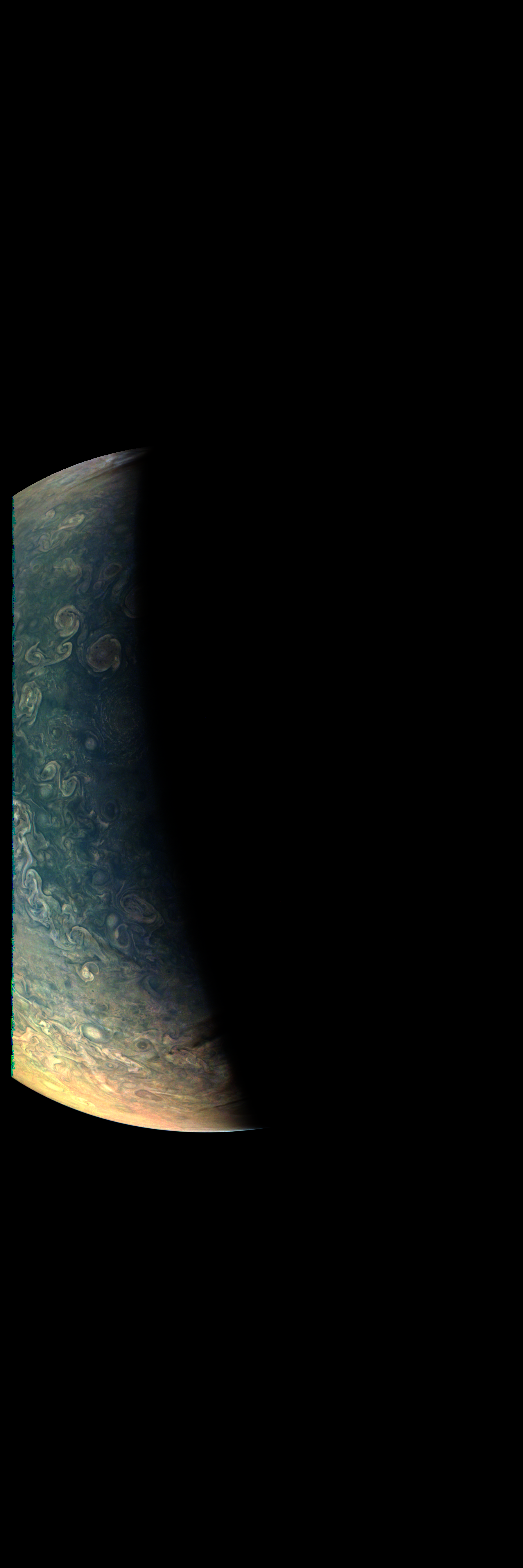 Junocam pixels are 12 bits deep from the camera but are converted to 8 bits inside the instrument using a lossless "companding" table, a process similar to gamma correction, to reduce their size. All Junocam products on the missionjuno website are in this 8-bit form as received on Earth. Scientific users interested in radiometric analysis should use the "RDR" data products archived with the Planetary Data System, which have been converted back to a linear 12-bit scale.